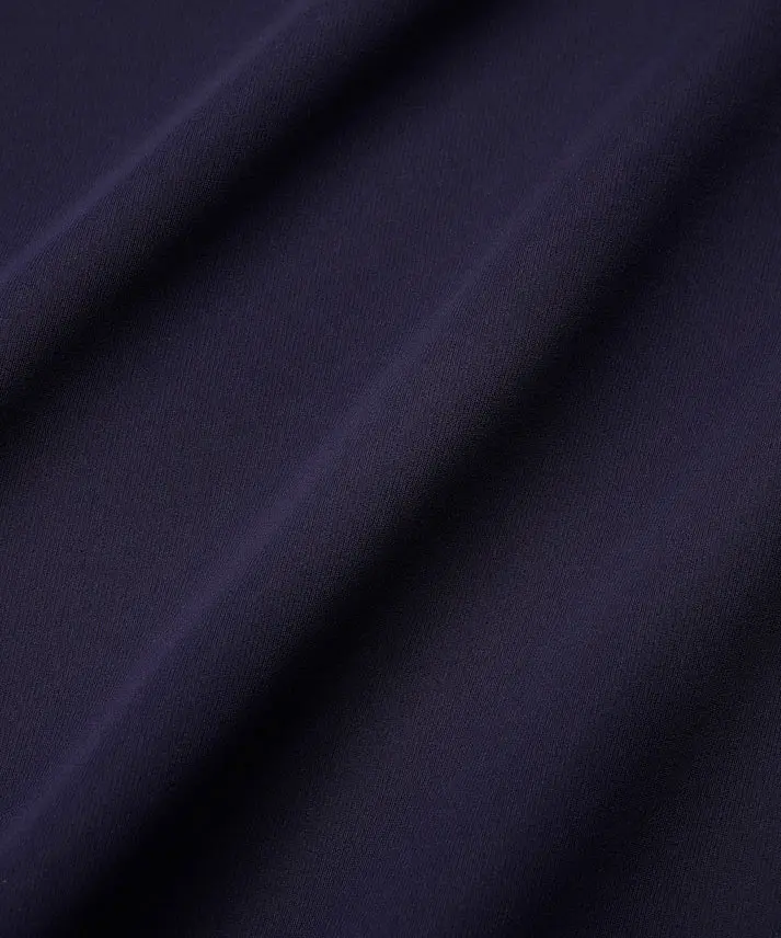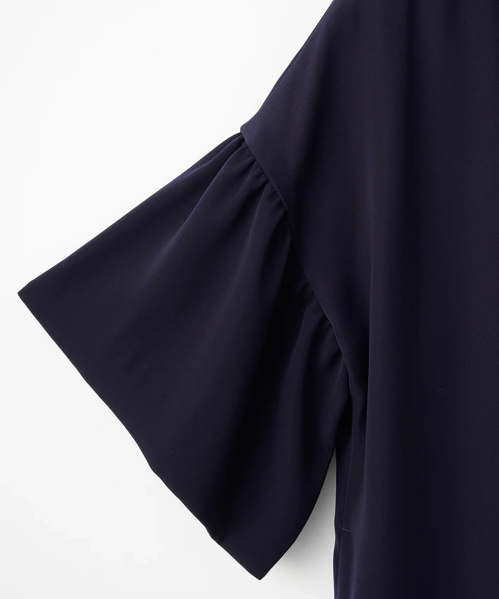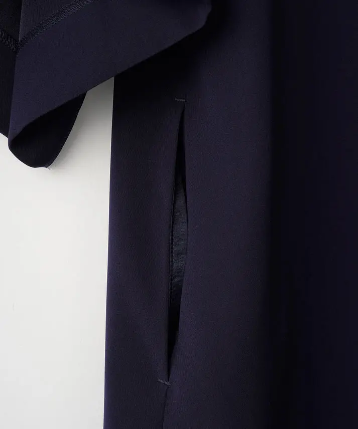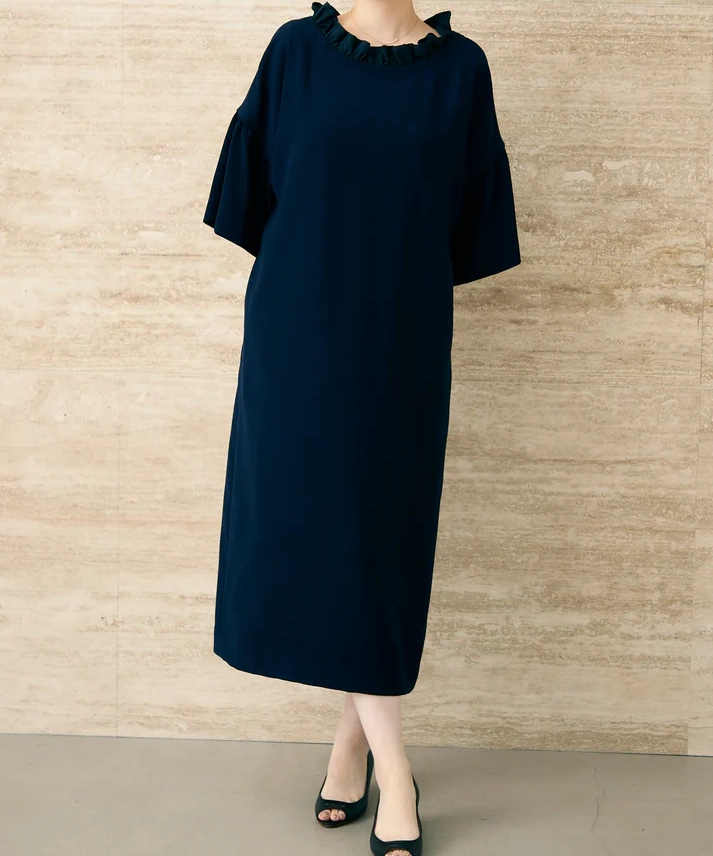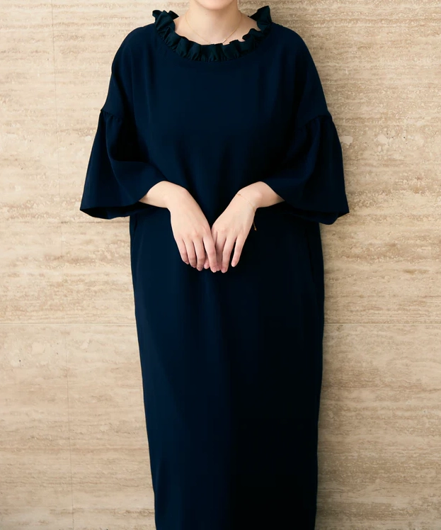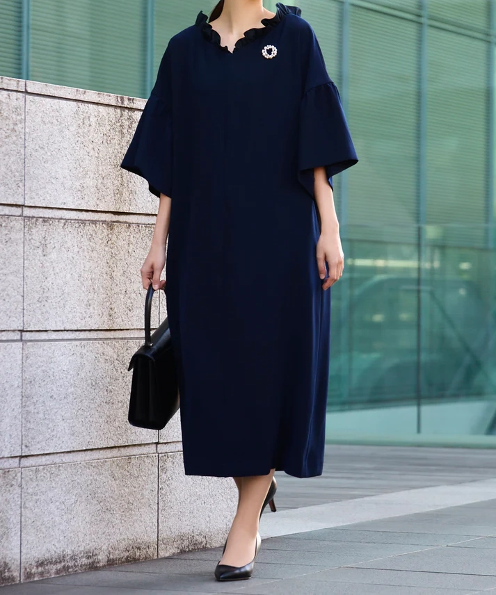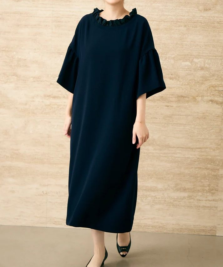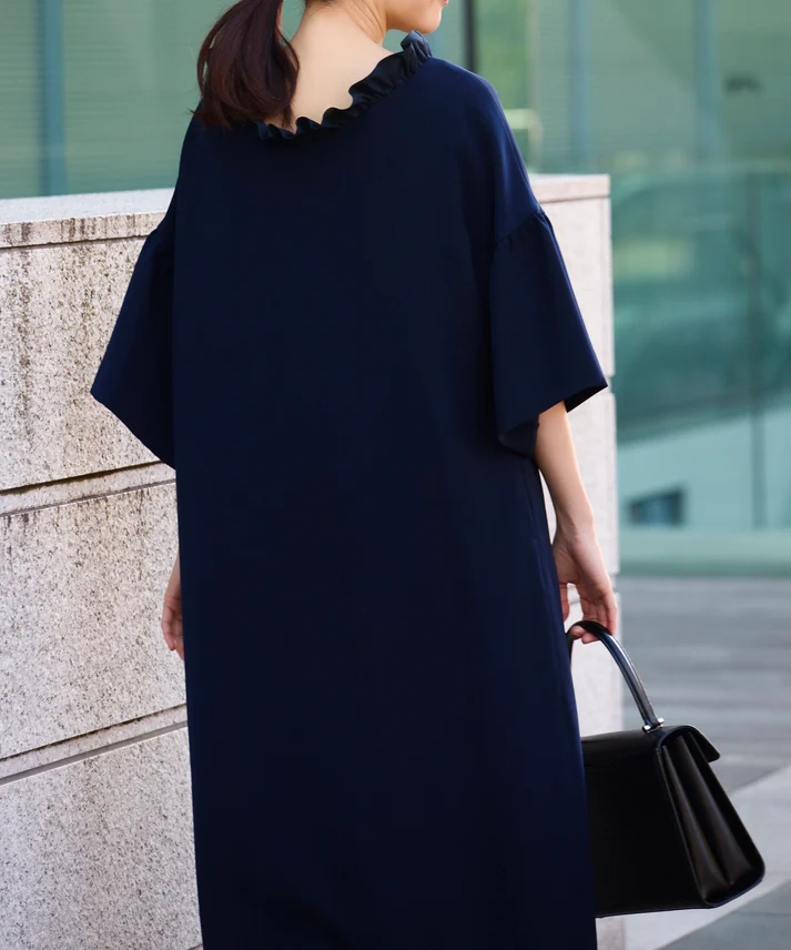 ネイビーの上品さに、ボートネック×フリルの華やぎがちょうどよく効いた1着です。前後どちらを前にしても着られる2way仕様なので、気分やヘアスタイルに合わせて印象チェンジできるのが魅力。全体はゆったりAラインで身体を締め付けにくく、袖もゆとりのあるデザインなので、長時間の式や会食でもラクにきれい見えします。透け感なし&裏地ありで安心感も◎です。