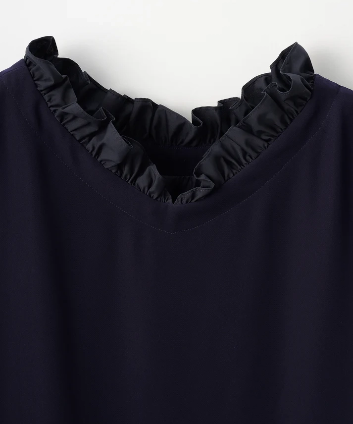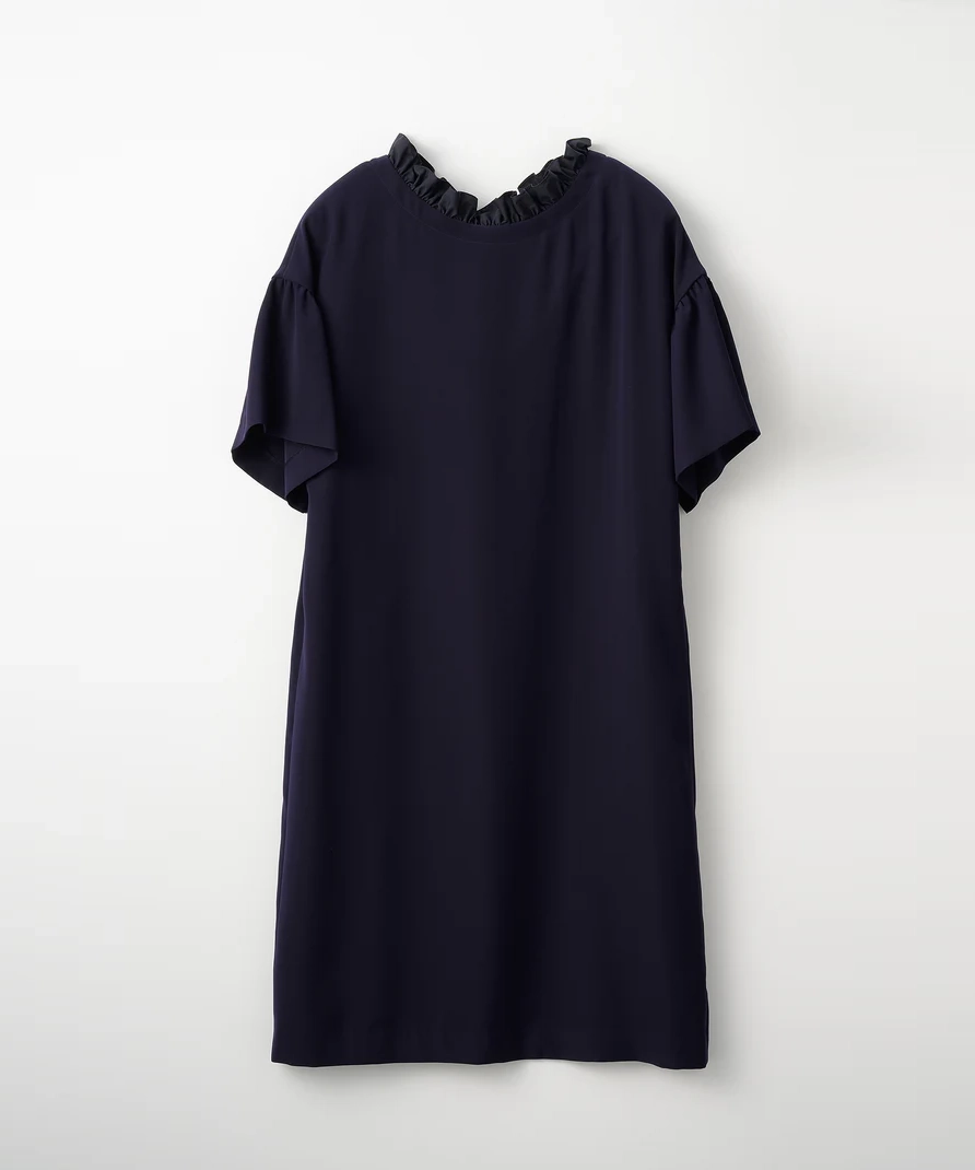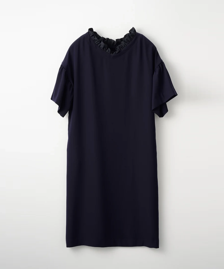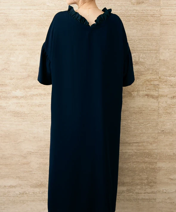 ボートネックにフリルをあしらった、華やかさと品の良さを両立したワンピース。前後どちらを前にしても着用できる2way仕様です。袖はやや広がりのあるデザインで腕まわりにゆとりがあり、全体はリラックス感のあるAラインシルエットで、締め付け感なく着用できます。透け感なし、裏地あり、伸縮性なし。