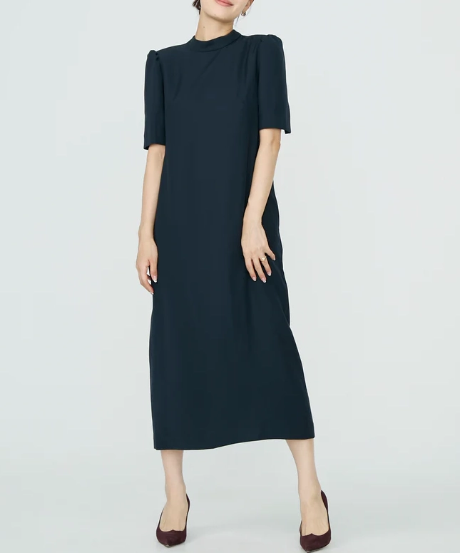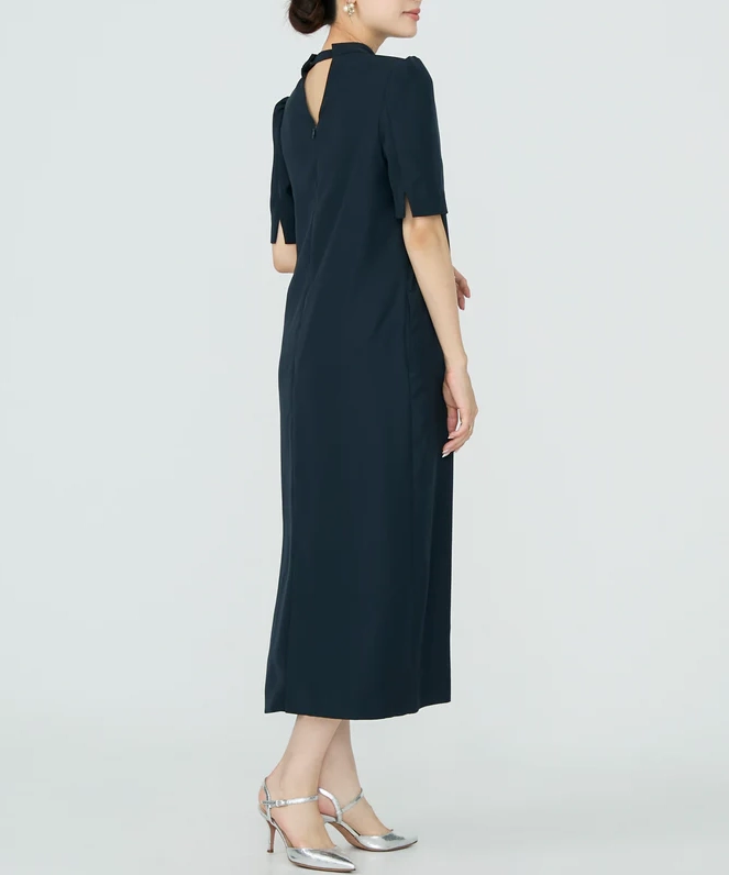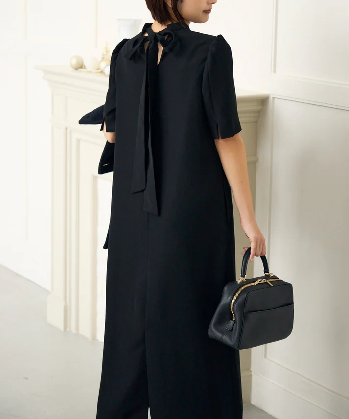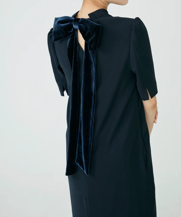ストンと落ちるIラインで大人っぽく決まるのに、リボンで印象を変えられる“着回し上手”なドレスです。ブラックは甘さが出にくく、リボンのベロアの光沢がさりげないアクセントに。肩のパフスリーブで立体感が出るので、1枚でも写真映えします。結婚式や二次会、ホテルディナーなどきちんとシーンはもちろん、リボンを控えめにすれば会食や式典にも使いやすいです。