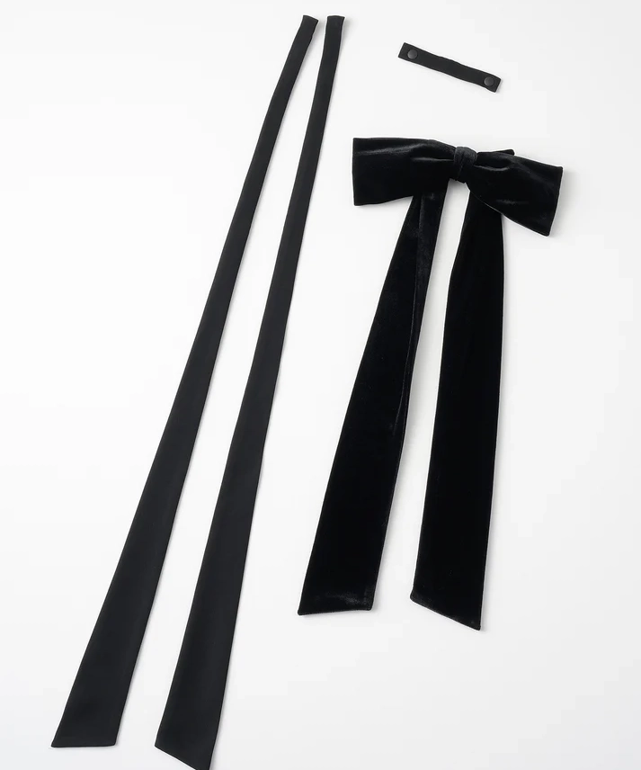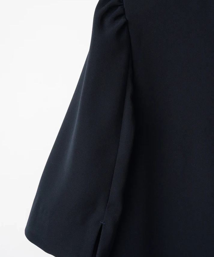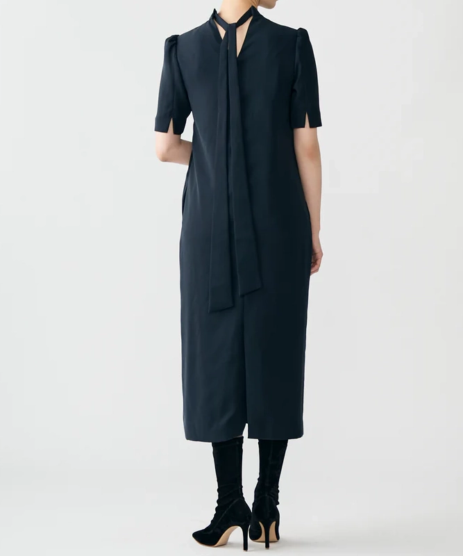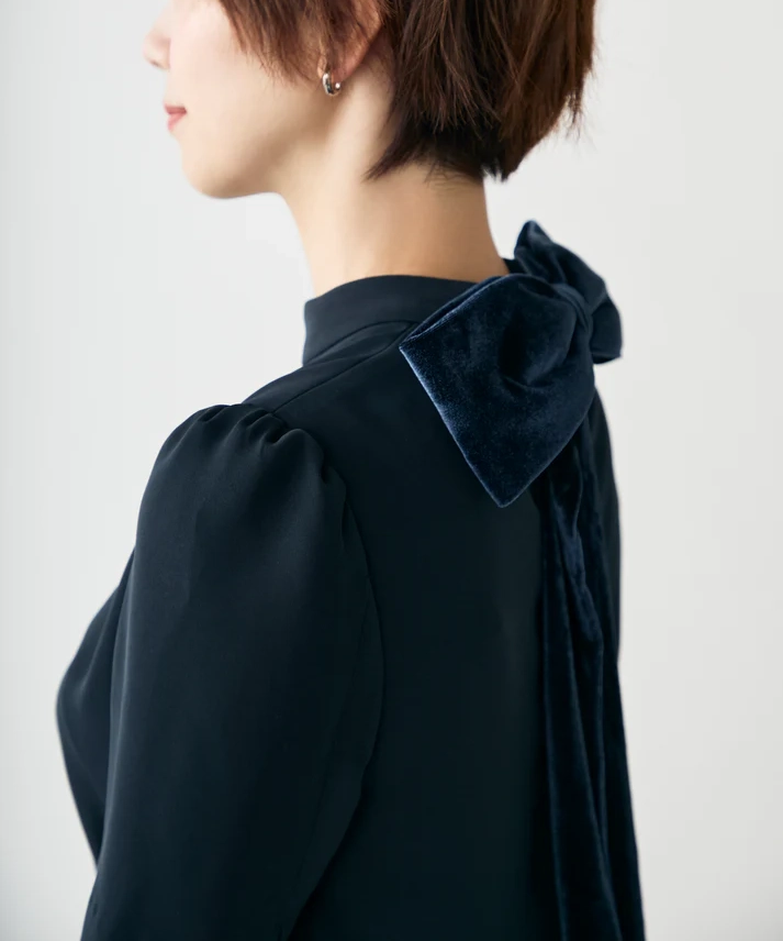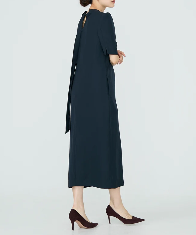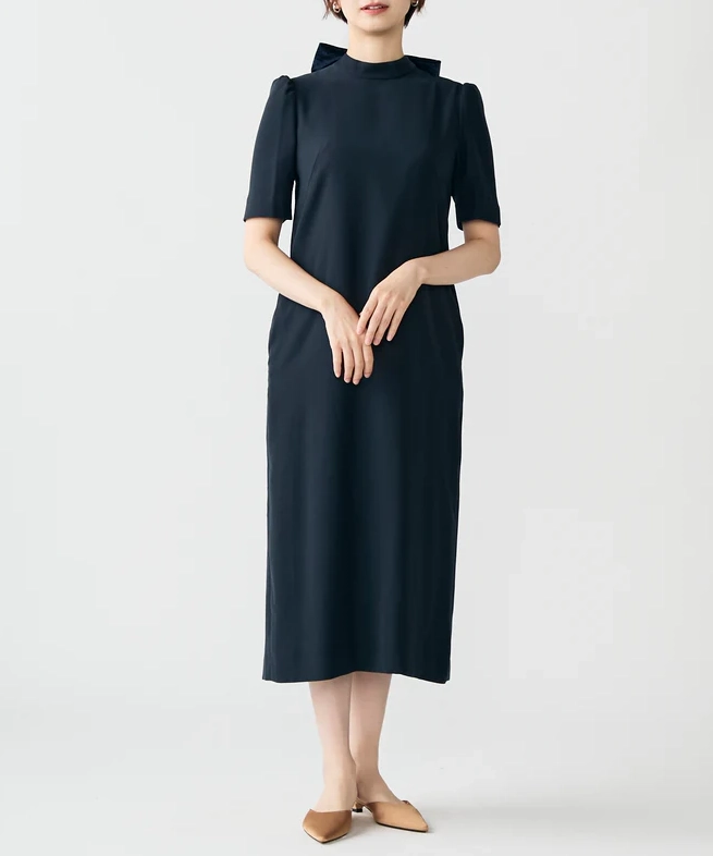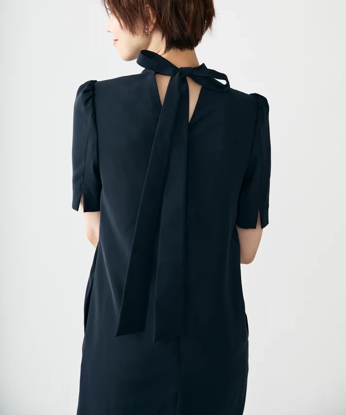 ストンと落ち感のあるIラインシルエットのドレス。リボンはスタイルに合わせて付け替えができる3パターン仕様で、着こなしの幅が広がります。肩にはさりげないパフスリーブを施し、立体感のある印象に。ブラックのリボンは光沢感のあるベロア素材で、上品なアクセントになります。透け感なし/裏地あり/伸縮性なし。リボンは取り外し・付け替え可能で、洗濯機の使用も可能です(詳細は洗濯表示をご確認ください)。