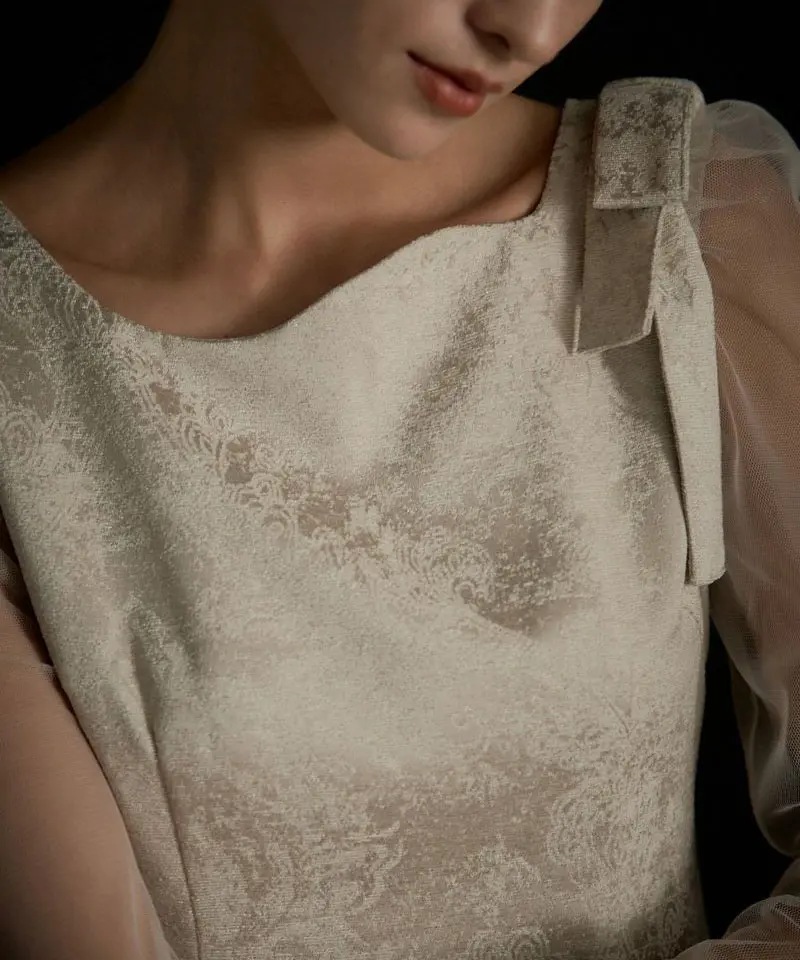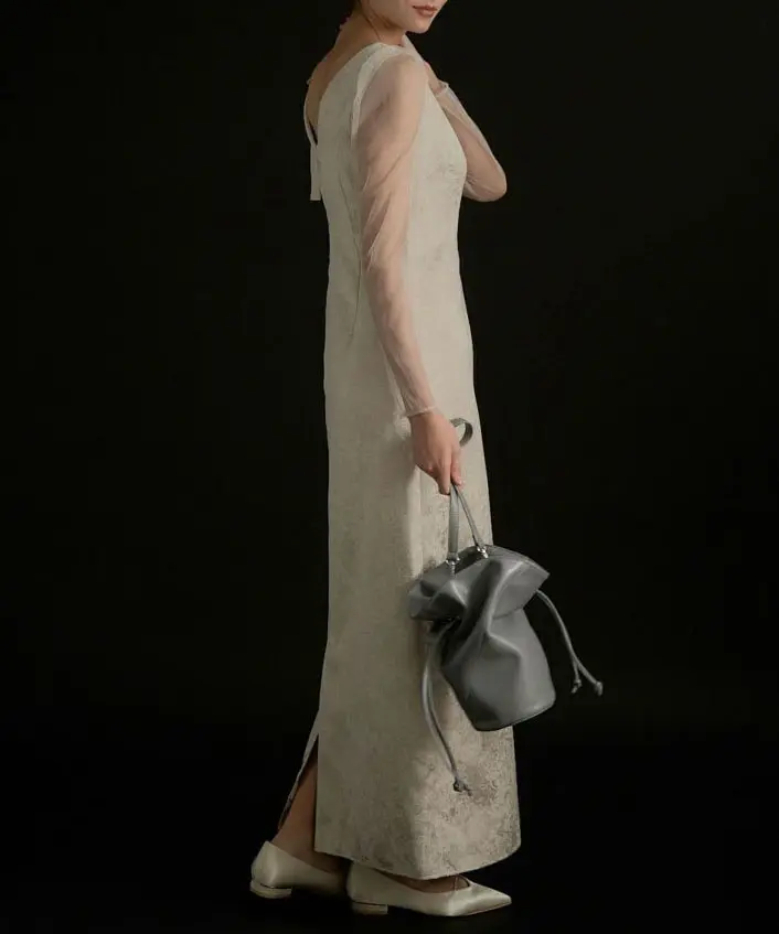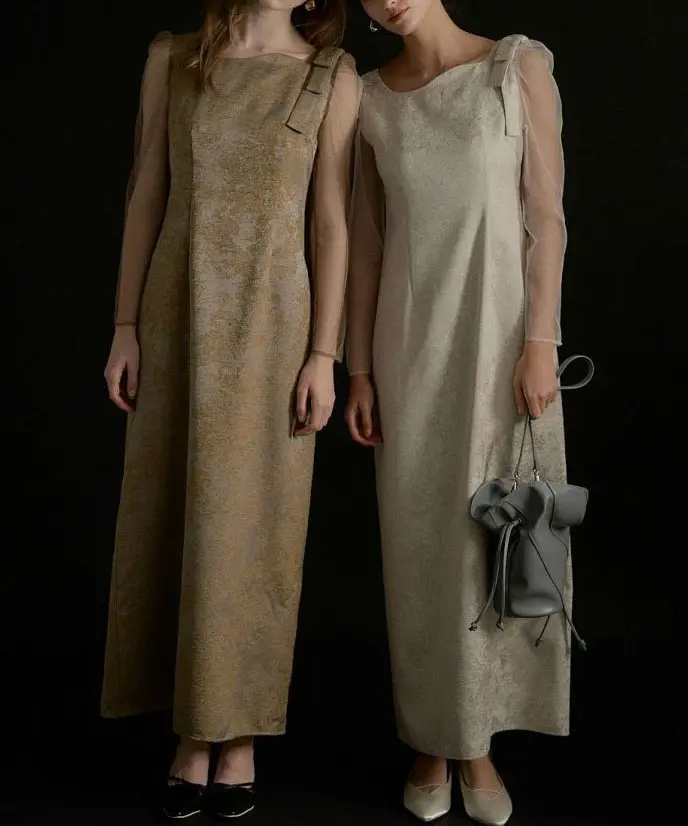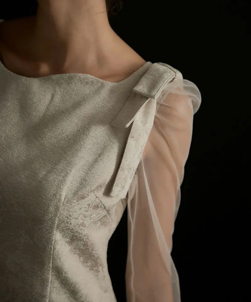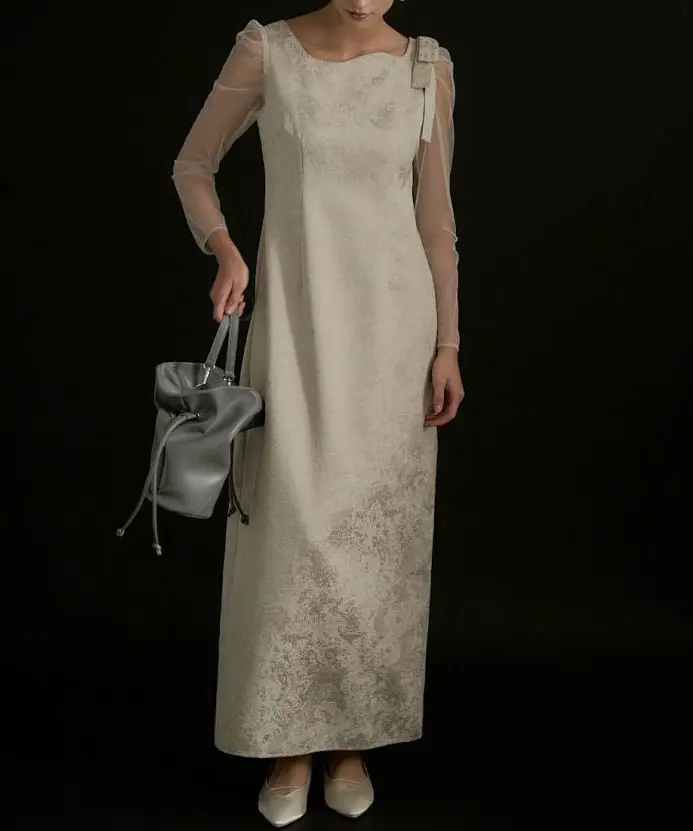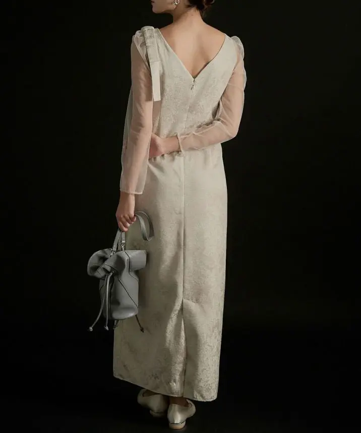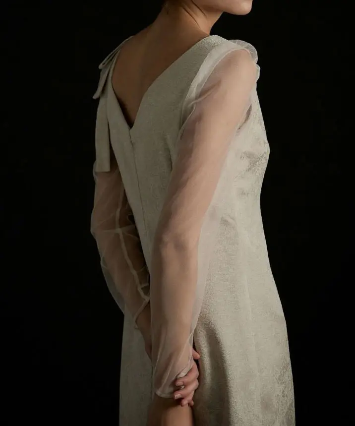 ’25 AWのジャガードドレスを、オールシーズン着られる仕様にアップデートした一着です。上品に仕立てたジャガード生地は、カラーごとに素材映えと華やかさが叶うのがポイント。ショルダー部分の立体リボンでトレンド感を添え、袖には柔らかなチュールを採用して軽やかな抜け感を演出します。バックファスナー仕様で着脱しやすく、バックスリット入りで足さばきも◎。