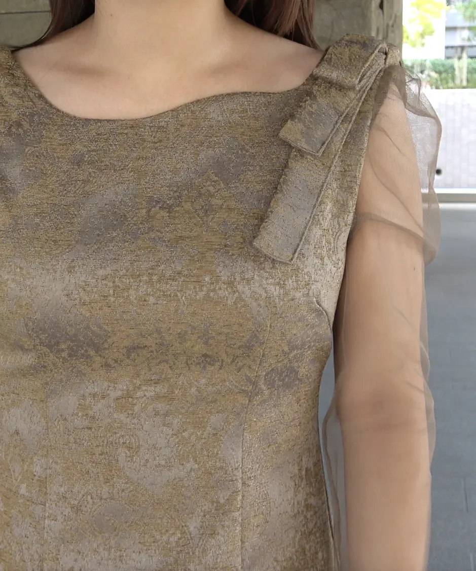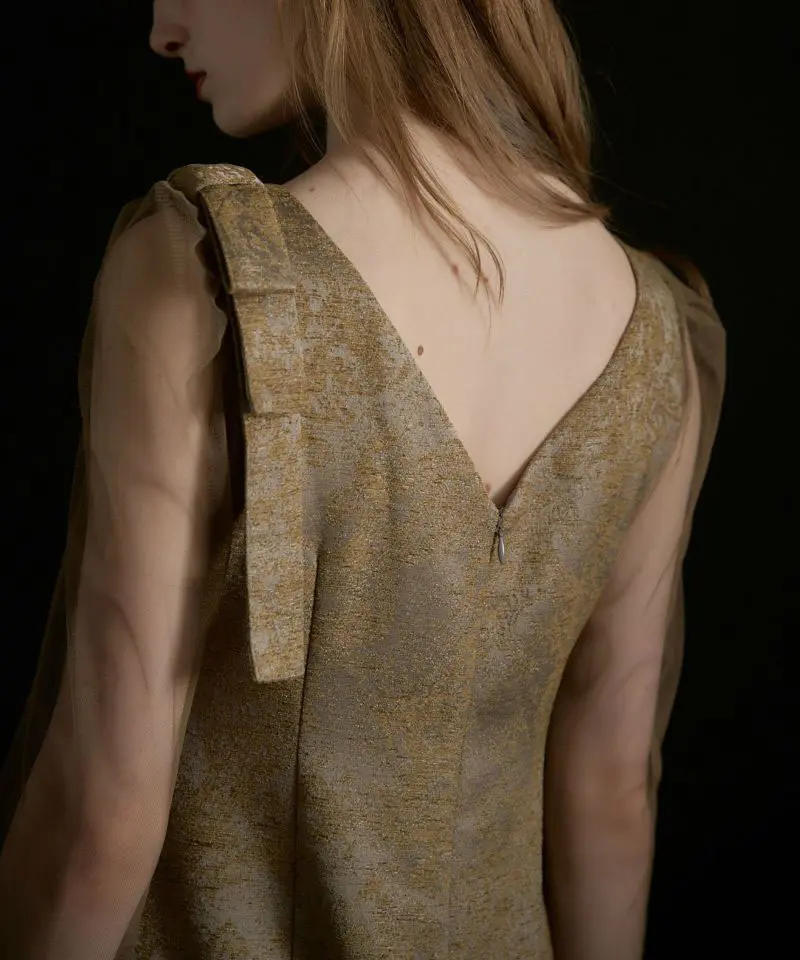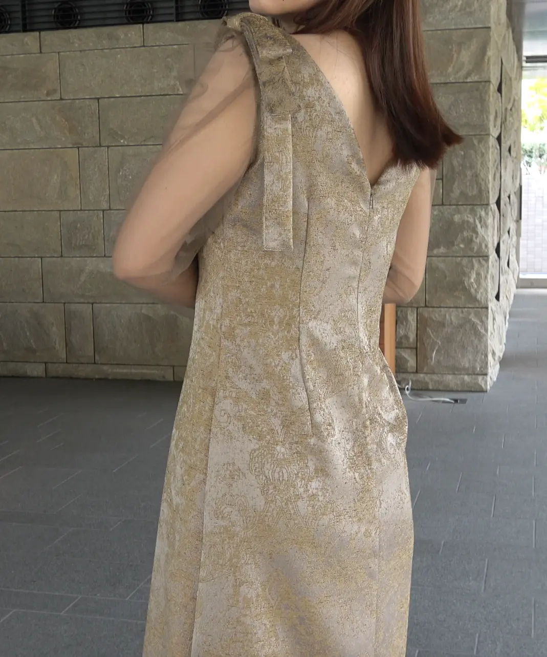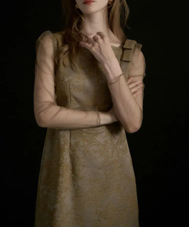 ’25 AWのジャガードドレスを、オールシーズン着られる仕様にアップデートした一着です。上品に仕立てたジャガード生地は、カラーごとに素材映えと華やかさが叶うのがポイント。ショルダー部分の立体リボンでトレンド感を添え、袖には柔らかなチュールを採用して軽やかな抜け感を演出します。バックファスナー仕様で着脱しやすく、バックスリット入りで足さばきも◎。