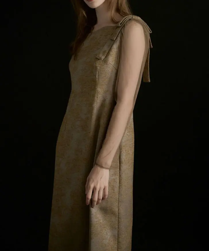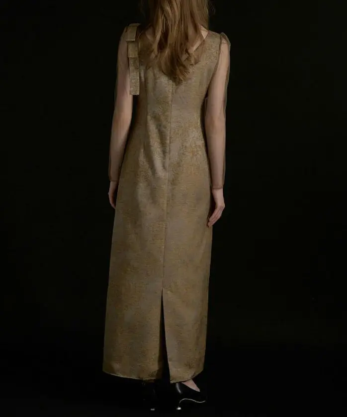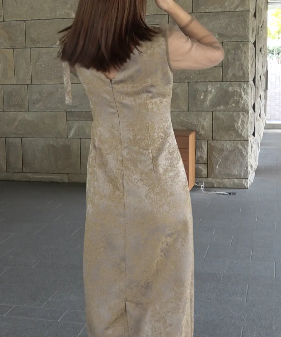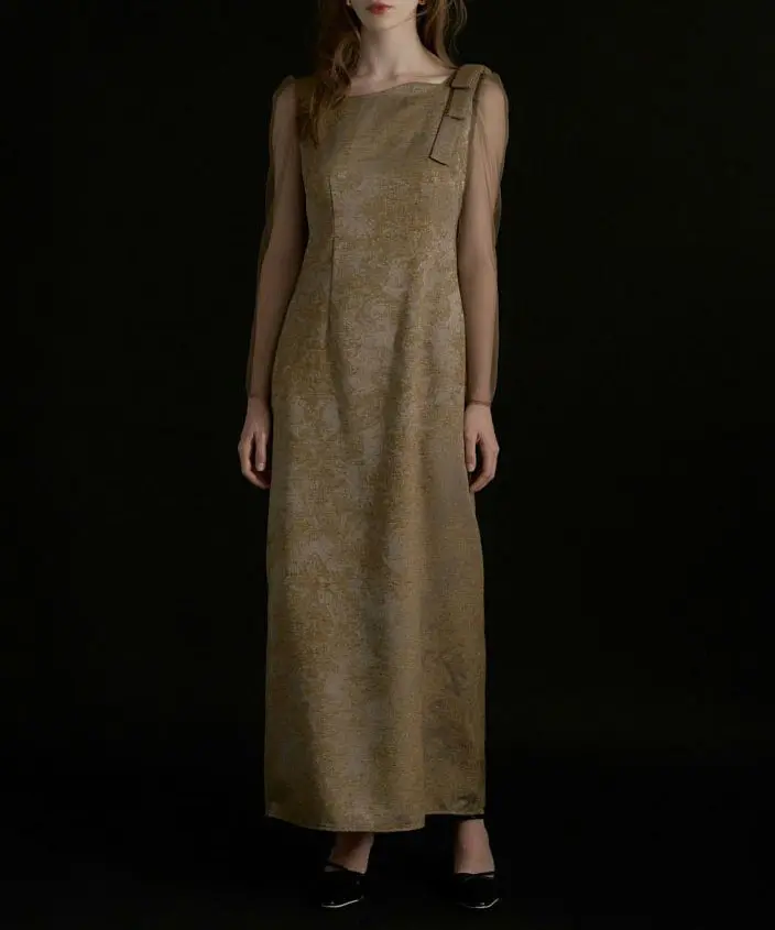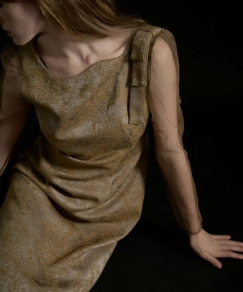 ’25 AWのジャガードドレスを、オールシーズン着られる仕様にアップデートした一着です。上品に仕立てたジャガード生地は、カラーごとに素材映えと華やかさが叶うのがポイント。ショルダー部分の立体リボンでトレンド感を添え、袖には柔らかなチュールを採用して軽やかな抜け感を演出します。バックファスナー仕様で着脱しやすく、バックスリット入りで足さばきも◎。