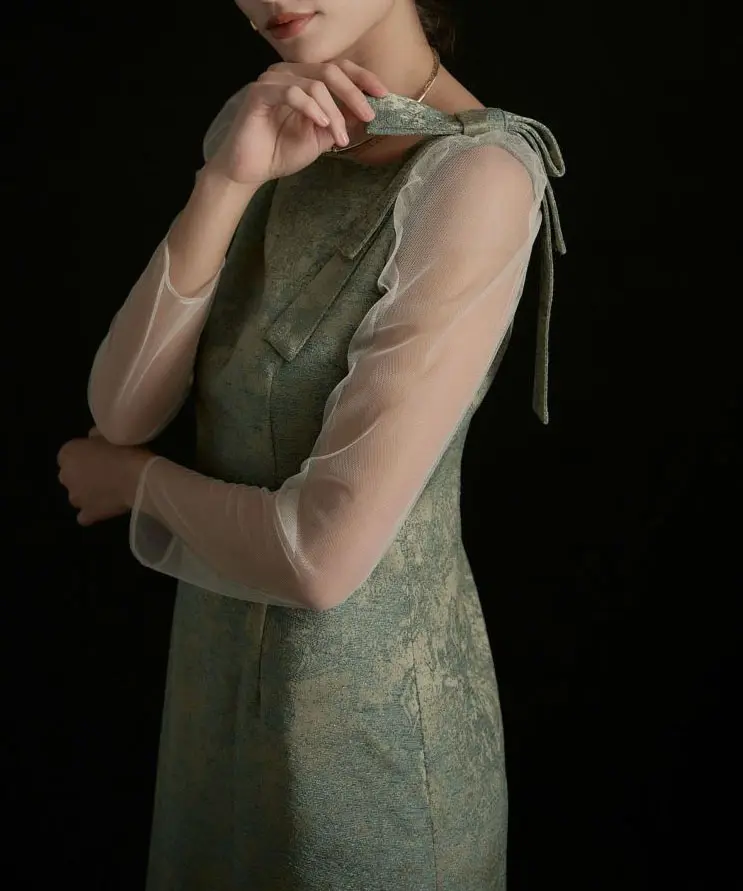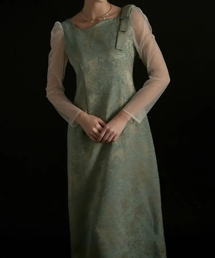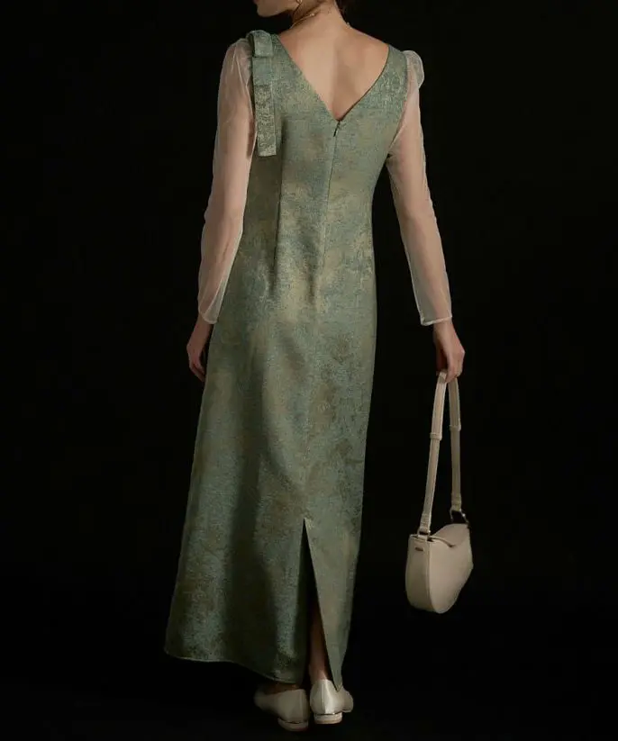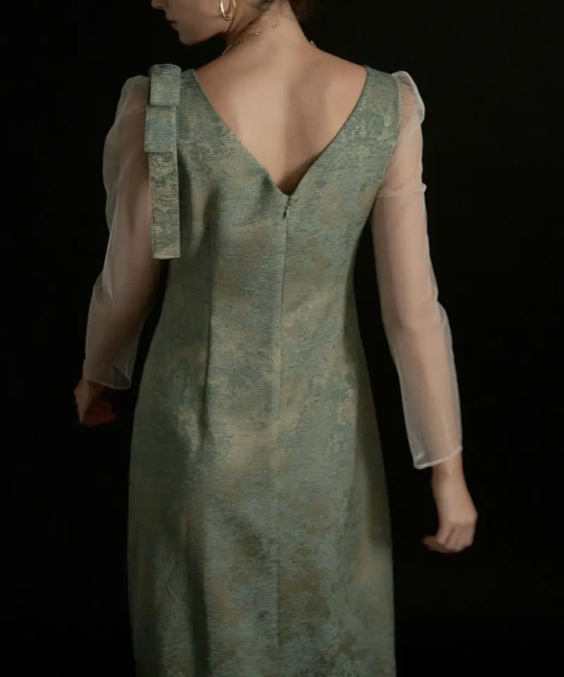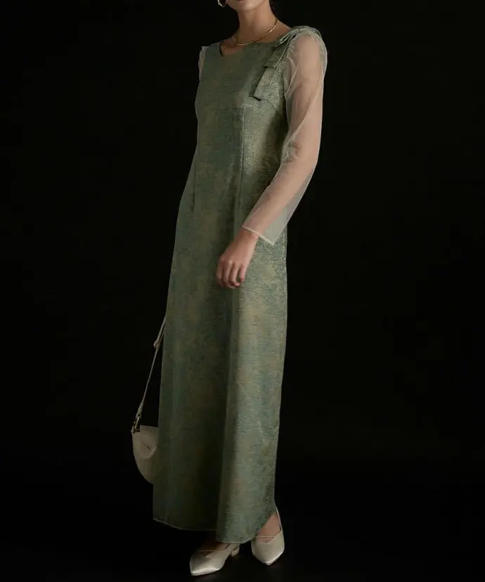 ’25 AWのジャガードドレスを、オールシーズン着られる仕様にアップデートした一着です。上品に仕立てたジャガード生地は、カラーごとに素材映えと華やかさが叶うのがポイント。ショルダー部分の立体リボンでトレンド感を添え、袖には柔らかなチュールを採用して軽やかな抜け感を演出します。バックファスナー仕様で着脱しやすく、バックスリット入りで足さばきも◎。