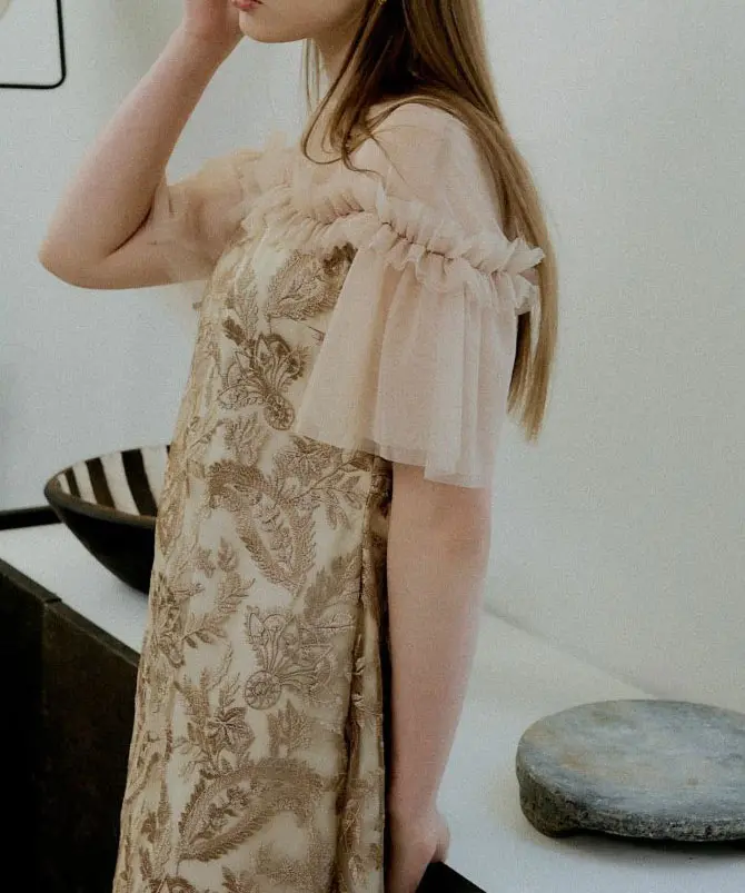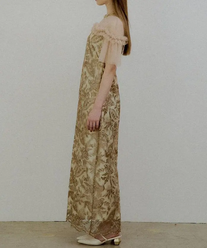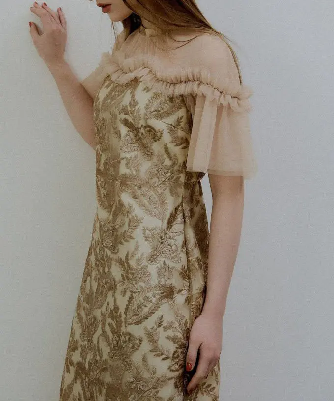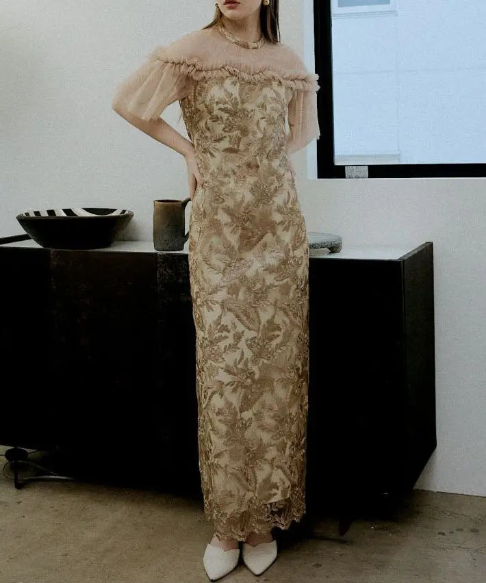 繊細なペイズリー刺繍が映えるレースドレス。2層チュールを使用した袖で華やかさをプラスし、うねりを効かせたデコルテのフリルデザインでLE’RUREらしい個性を添えています。首元はハイネック仕様で、レースドレスを大人っぽく引き締めるバランスに。バックファスナー仕様で着脱しやすく、袖部分は透け感があります。お手入れはクリーニング店へご相談ください。