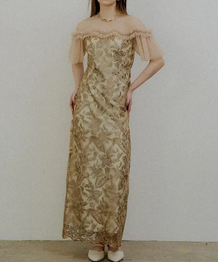 繊細なペイズリー刺繍がぱっと目を惹く、LE’RUREらしい“ひと癖レース”の主役ドレスです。2層チュールの袖がほどよいボリューム感を出して、腕まわりをふんわりカバーしつつ写真映えも◎。デコルテのうねりフリルが他にないポイントですが、首元はすっきりハイネックなので甘くなりすぎず、大人っぽく締まります。結婚式や二次会はもちろん、成人式・同窓会・演奏会など華やぎが欲しいシーンにもおすすめです。