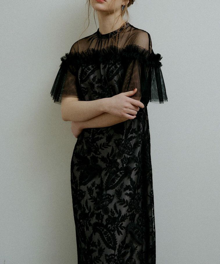 繊細なペイズリー刺繍が映えるレースドレス。2層チュールを使用した袖で華やかさをプラスし、うねりを効かせたデコルテのフリルデザインでLE’RUREらしい個性を添えています。首元はハイネック仕様で、レースドレスを大人っぽく引き締めるバランスに。バックファスナー仕様で着脱しやすく、袖部分は透け感があります。お手入れはクリーニング店へご相談ください。