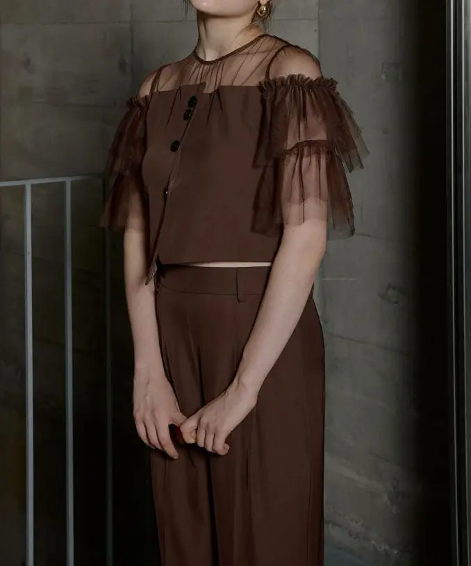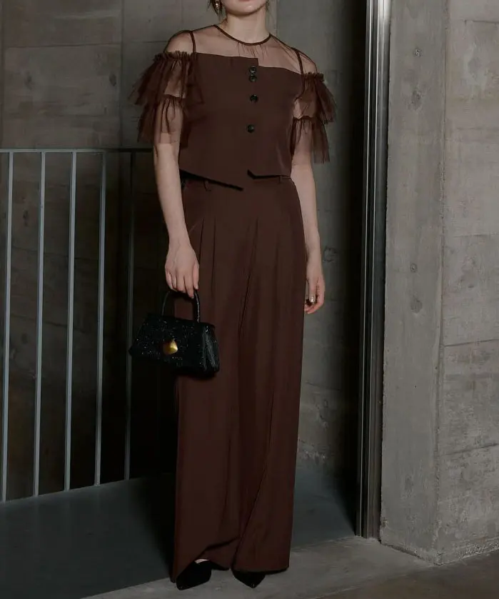 “きちんと感”が欲しい日に頼れる、パンツ派さんのための上品セットアップ。トップスはコンパクトでバランスよく、パンツはワイドストレートで脚のラインを拾いにくいのにスタイルアップが狙えます。肩のチュールフリルが顔まわりを華やかにしつつ、二の腕もさりげなくカバーしてくれるのが嬉しいポイント。とろみのある落ち感素材で動くたびにしなやかに揺れ、写真でもきれいに映えます。ポケット付きで実用性も◎。結婚式・二次会はもちろん、きちんと見せたい会食やお食事会にもおすすめです。