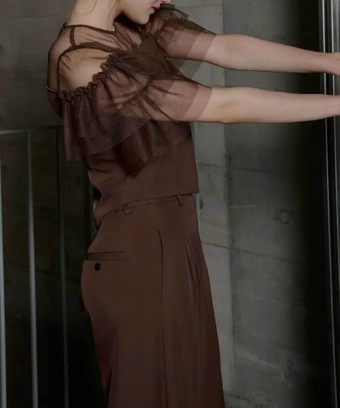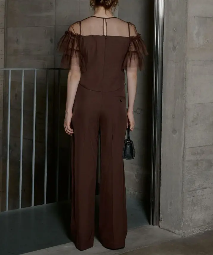 上品さと抜け感を両立させた、イレギュラーデザインのパンツドレス(セットアップ)です。とろみのある落ち感素材が体のラインをきれいに見せ、動くたびにしなやかに揺れるシルエットが印象的。肩のチュールフリルで大人の華やかさをプラスし、程よい肌見せで軽さも演出します。トップスはバックファスナー仕様でデザインボタン付き。パンツはサイドポケット付き(バックポケットはデザイン仕様)、背面ゴム入りで着心地にも配慮されています。お手入れはクリーニング店へご相談ください。
