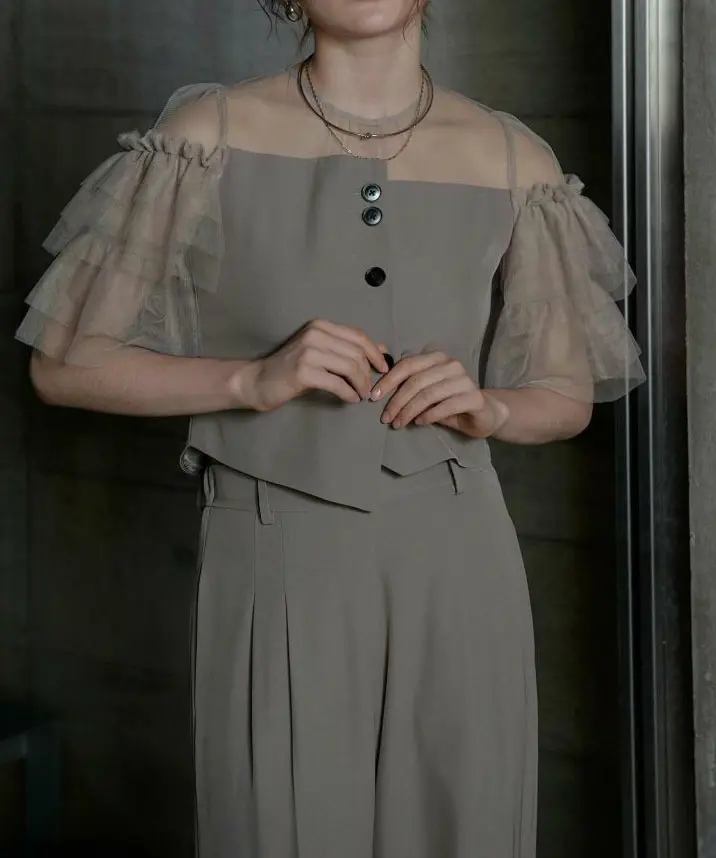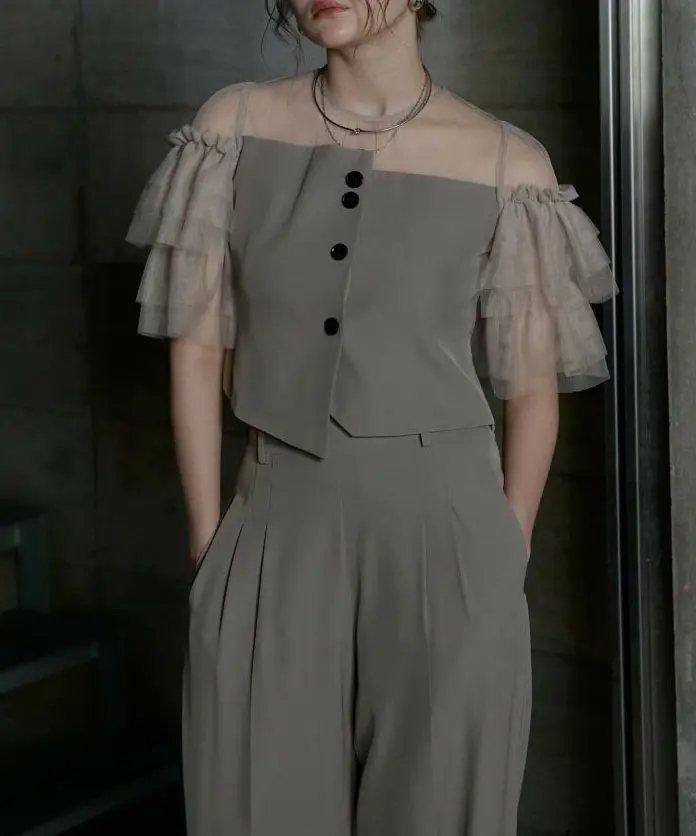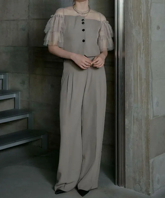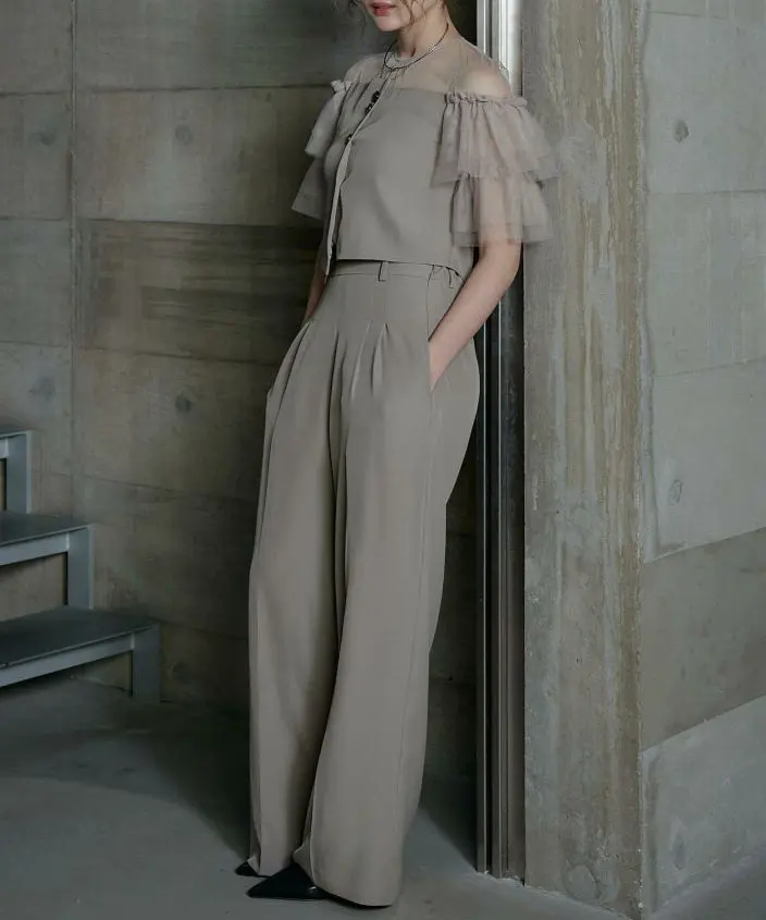 “きちんと感”が欲しい日に頼れる、パンツ派さんのための上品セットアップ。トップスはコンパクトでバランスよく、パンツはワイドストレートで脚のラインを拾いにくいのにスタイルアップが狙えます。肩のチュールフリルが顔まわりを華やかにしつつ、二の腕もさりげなくカバーしてくれるのが嬉しいポイント。とろみのある落ち感素材で動くたびにしなやかに揺れ、写真でもきれいに映えます。ポケット付きで実用性も◎。結婚式・二次会はもちろん、きちんと見せたい会食やお食事会にもおすすめです。