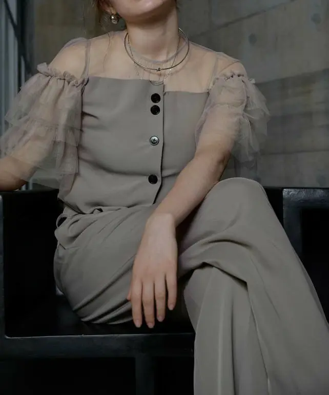上品さと抜け感を両立させた、イレギュラーデザインのパンツドレス(セットアップ)です。とろみのある落ち感素材が体のラインをきれいに見せ、動くたびにしなやかに揺れるシルエットが印象的。肩のチュールフリルで大人の華やかさをプラスし、程よい肌見せで軽さも演出します。トップスはバックファスナー仕様でデザインボタン付き。パンツはサイドポケット付き(バックポケットはデザイン仕様)、背面ゴム入りで着心地にも配慮されています。お手入れはクリーニング店へご相談ください。