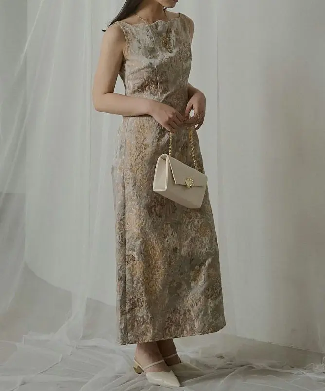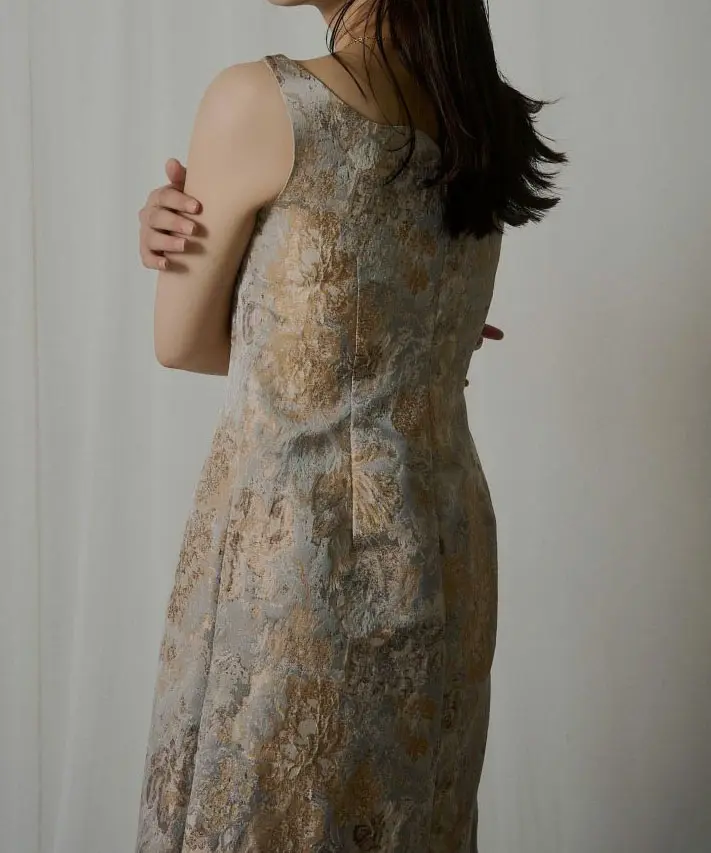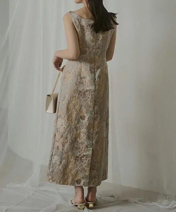 都会的で存在感のあるジャガードが主役になる1着です。デコルテのひと癖デザインが顔まわりをやわらかく見せ、甘くなりすぎずに“LE’RUREらしさ”が出せるのが魅力。ウエストは程よくシェイプされているのでスタイルアップが狙えつつ、スカートは丸みのあるコクーンシルエットで歩きやすさも◎。薄手で軽やかなジャガードなので、シアー/チュールのレイヤードやジャケット合わせ、冬はファーコートとも相性がよく、オケージョン以外の特別な日にも活躍します。