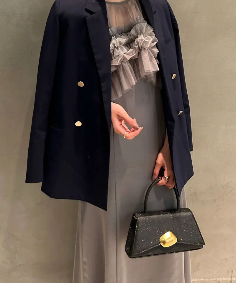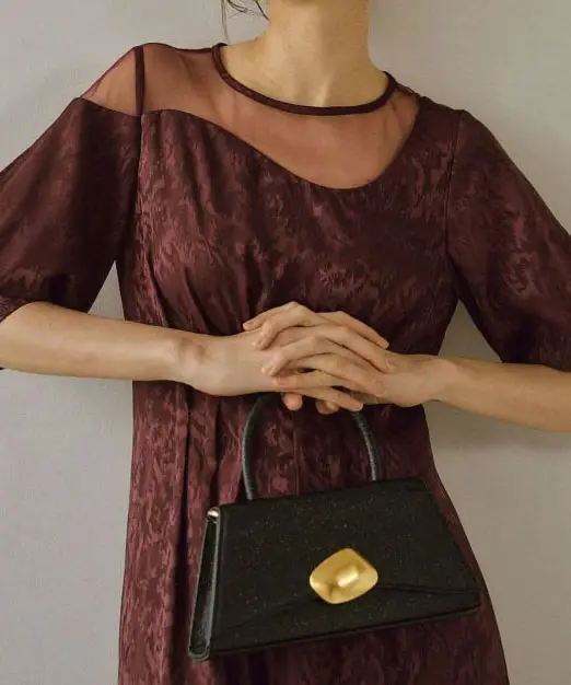 上品な光沢感のトランペジウムフォルムで、持つだけでコーデが引き締まるLE’RUREの定番パーティーバッグです。小ぶりでもマチがあり、必要なアイテムが収まりやすいのが嬉しいポイント。ゴールド(またはシルバー)のストーン風チャームがさりげなく華やかで、結婚式や二次会はもちろん、きれいめカジュアルのアクセントとしても活躍します。チェーンは取り外しできるので、ハンド持ち・ショルダー持ちをシーンに合わせて使い分けできます。