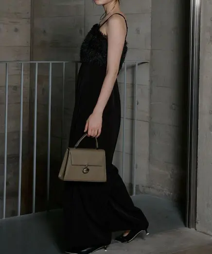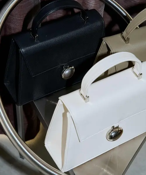 LE’RUREの「Bell motif boxy bag」。ボックス型のハンドバッグにベルモチーフをあしらったデザインで、コーディネートを上品に格上げしてくれます。素材は表地が合成皮革、裏地がポリエステルで、カラーはアイボリー/ブラック/カーキ、サイズはFREEです。