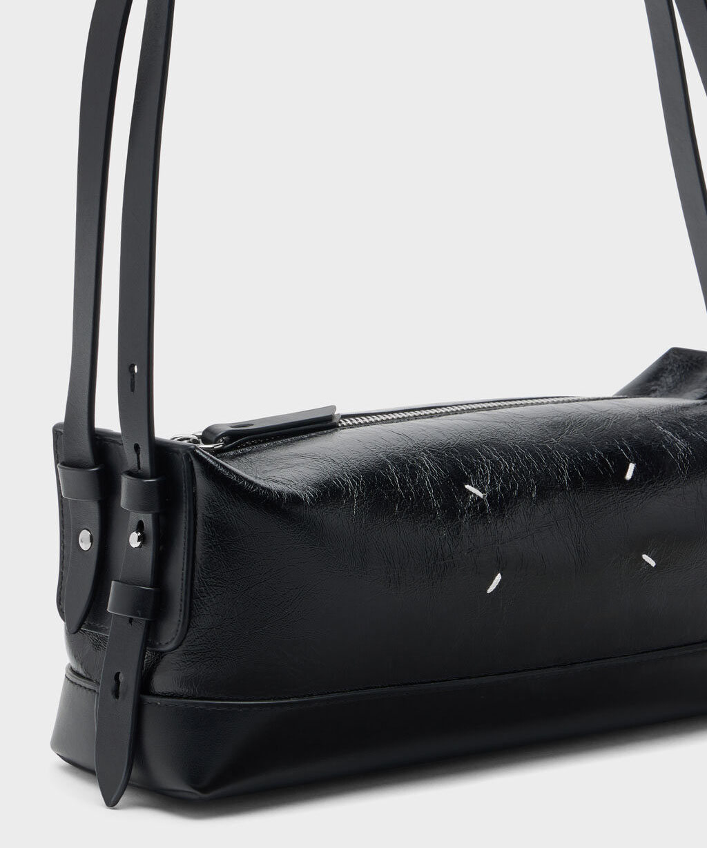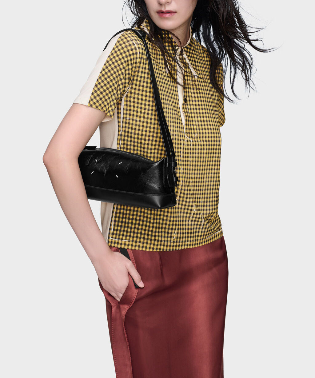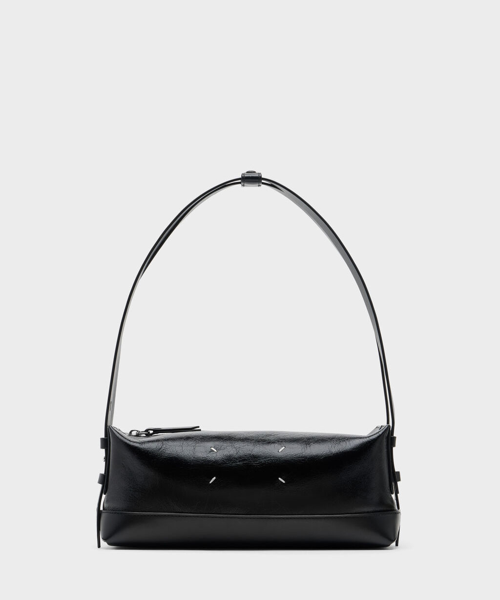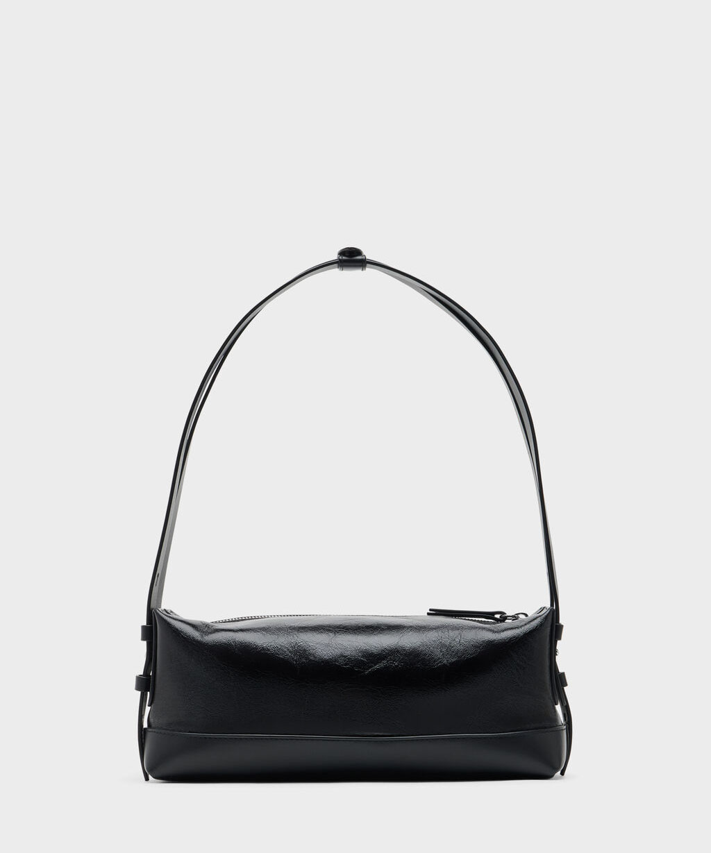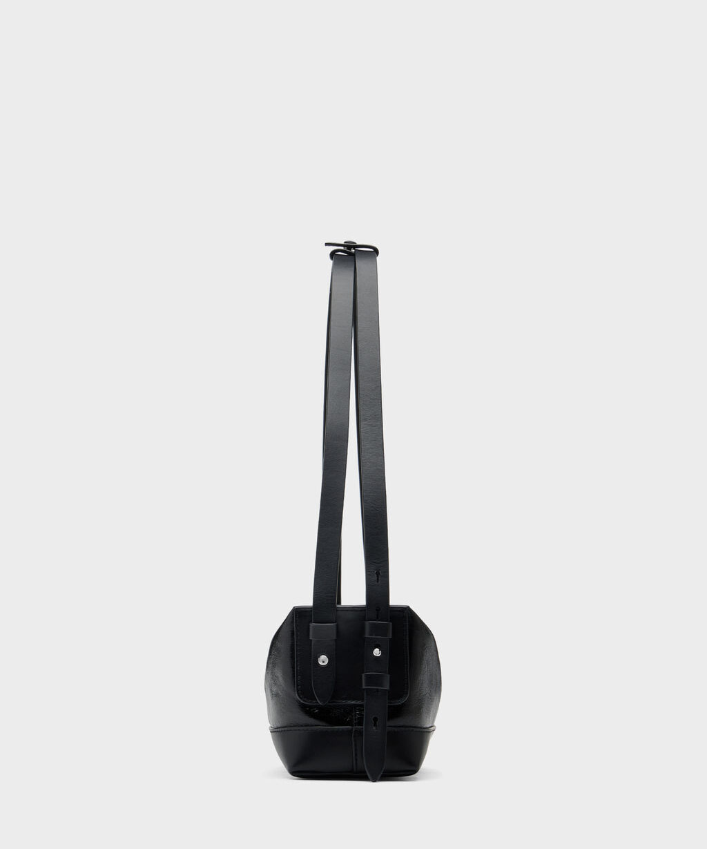 シワ加工のグロッシーレザーが主役の、コンパクトなドローストリングバケットバッグ。光の当たり方で艶が出るので、シンプルなドレスやセットアップに合わせるだけで“きちんと華やぐ”のが魅力です。ベルト式ハンドルは長さ調節ができ、シーンに合わせて持ち方のバランスを変えられるのも嬉しいポイント。フロントの4ステッチは主張しすぎないのに存在感があり、アクセ感覚でコーデを格上げしてくれます。