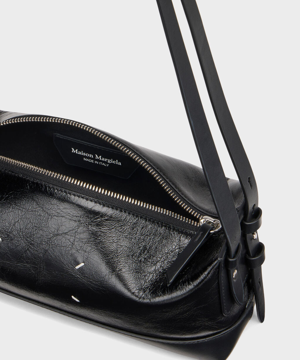シワ加工を施した光沢のあるレザーとカーフレザーを使用した、コンパクトなドローストリング バケットバッグ。上部はベルト式ハンドルで長さ調節が可能です。立体的なシルエットに、メタリックなファスナー開閉を組み合わせたデザイン。背面にはメゾンを象徴する4本ステッチ、内側にはロゴ刻印入り。イタリア製。