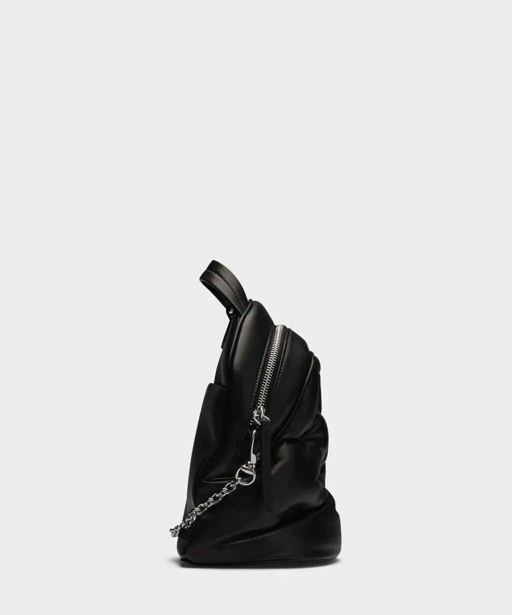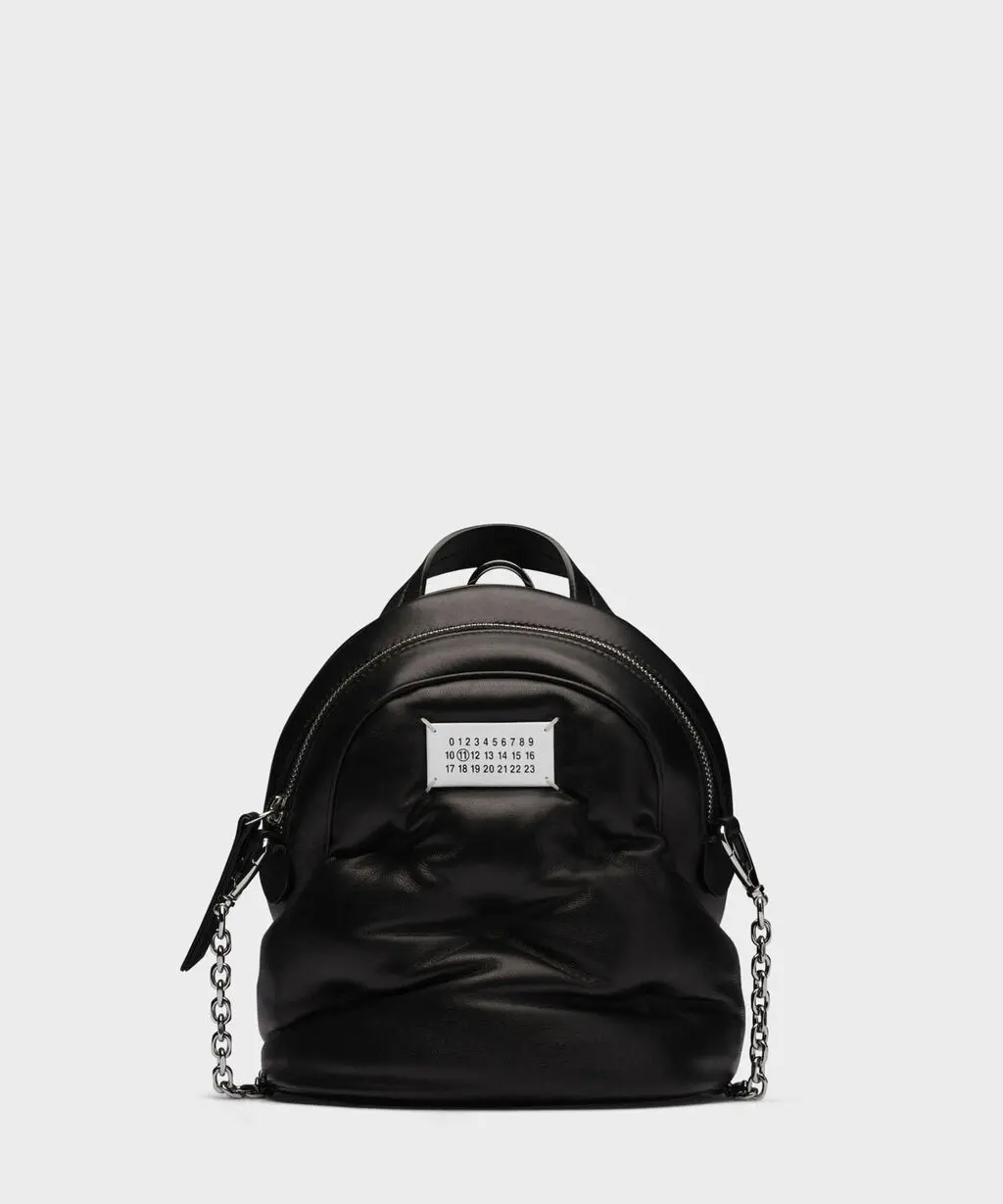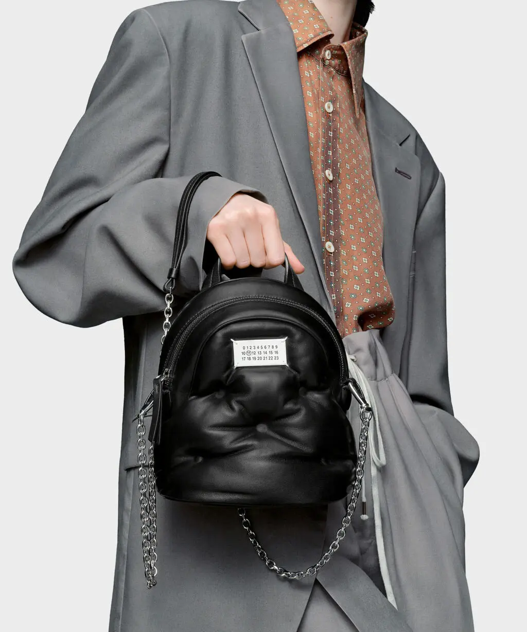 “ふわっとしたキルティング”なのに、マルジェラらしい端正さが残るグラム スラムのバックパック。小ぶりでアクセ感覚で持てるサイズ感なのに、ジップ開閉で中身が見えにくく実用性も◎です。チェーンストラップは取り外し可能で、バックパック風にも、ショルダー風にも持ち替えできるのが嬉しいポイント。フロントのナンバリングロゴラベルがさりげなく効いて、オケージョンのきれいめコーデに合わせても“抜けすぎない洒落感”が出ます。