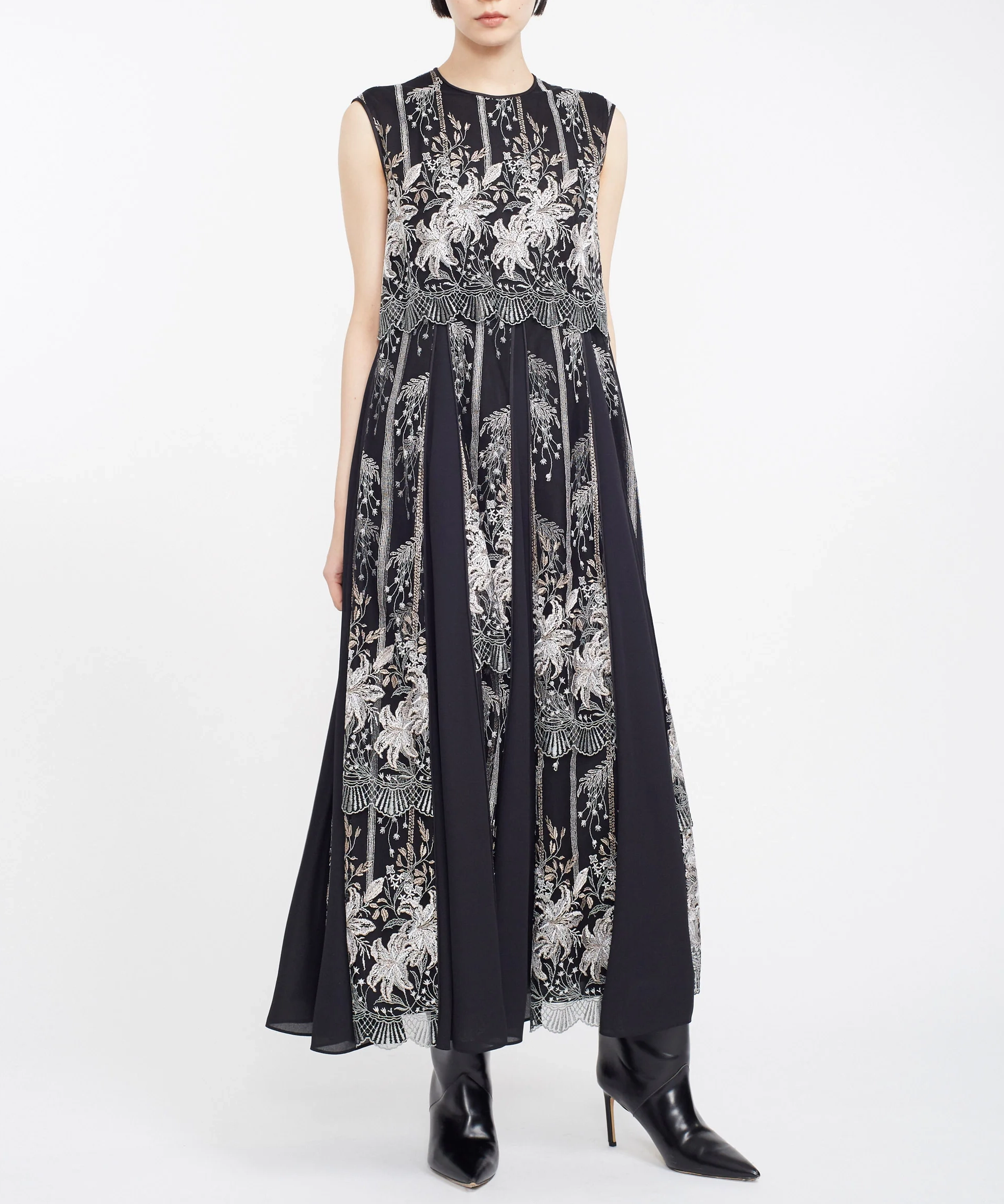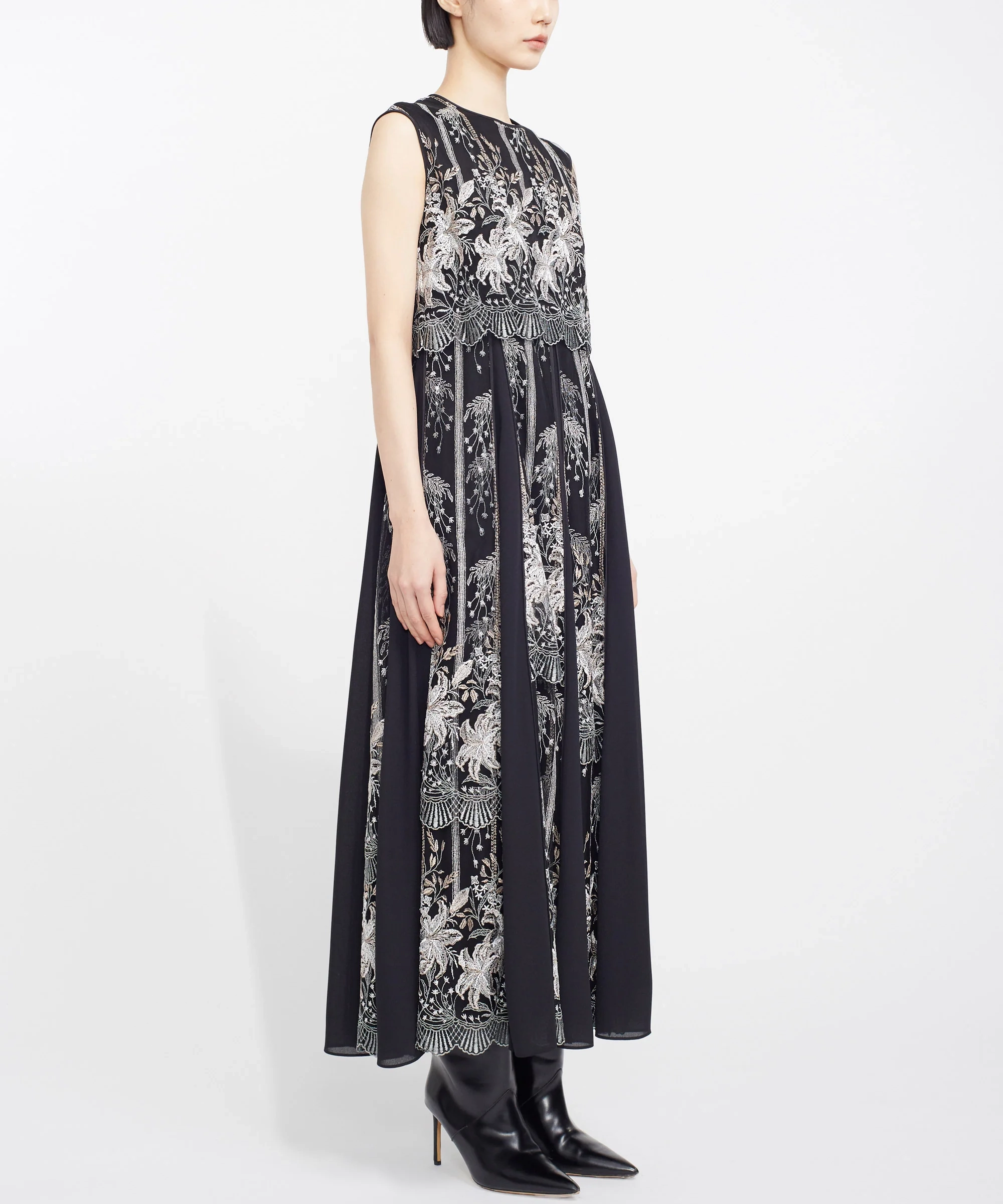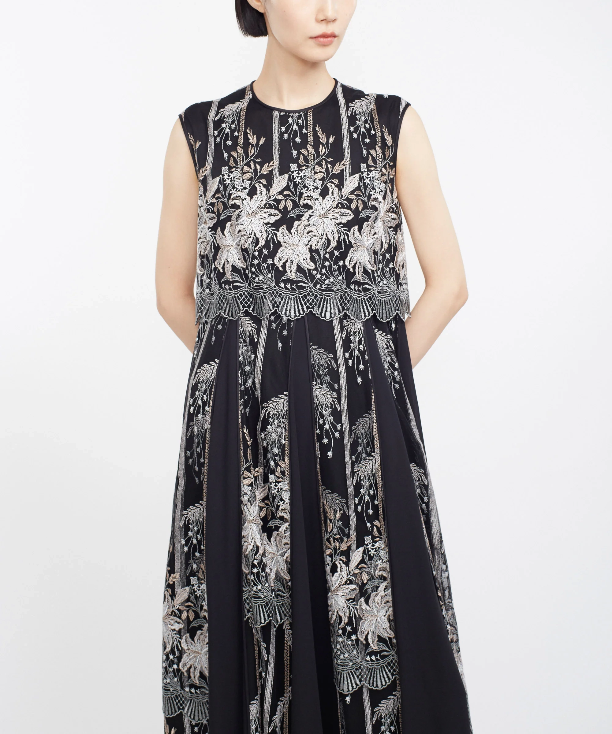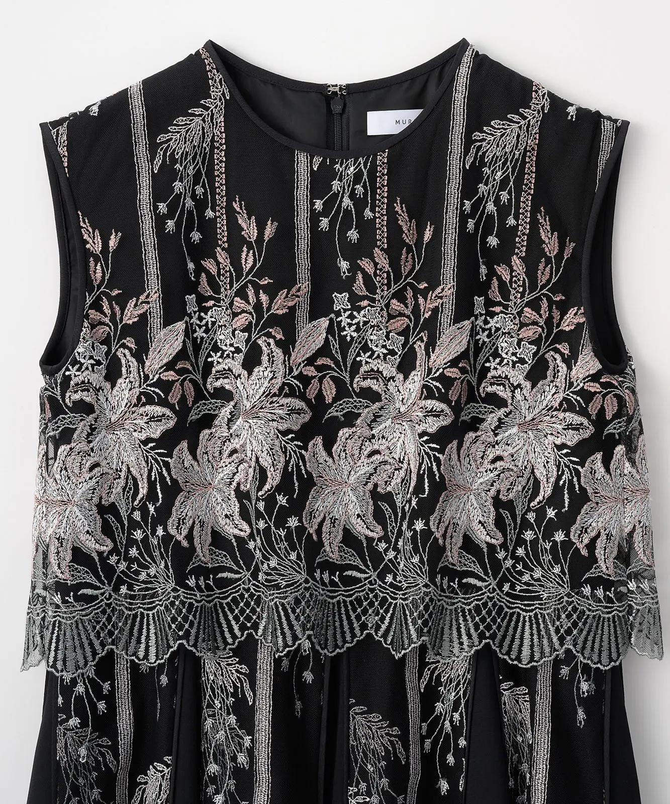 MURRALらしい芸術的な刺繍が目を引くドレス。繊細なラインで描かれたモチーフが、シンプルなベースに映え、上品で洗練された印象を演出します。
