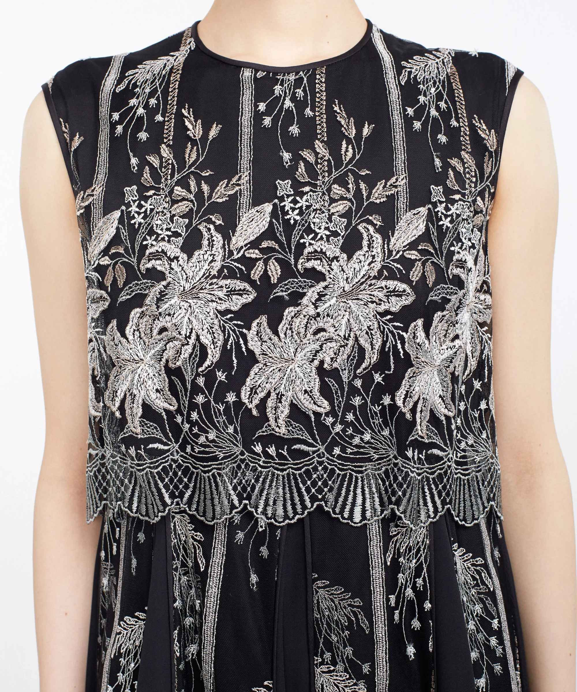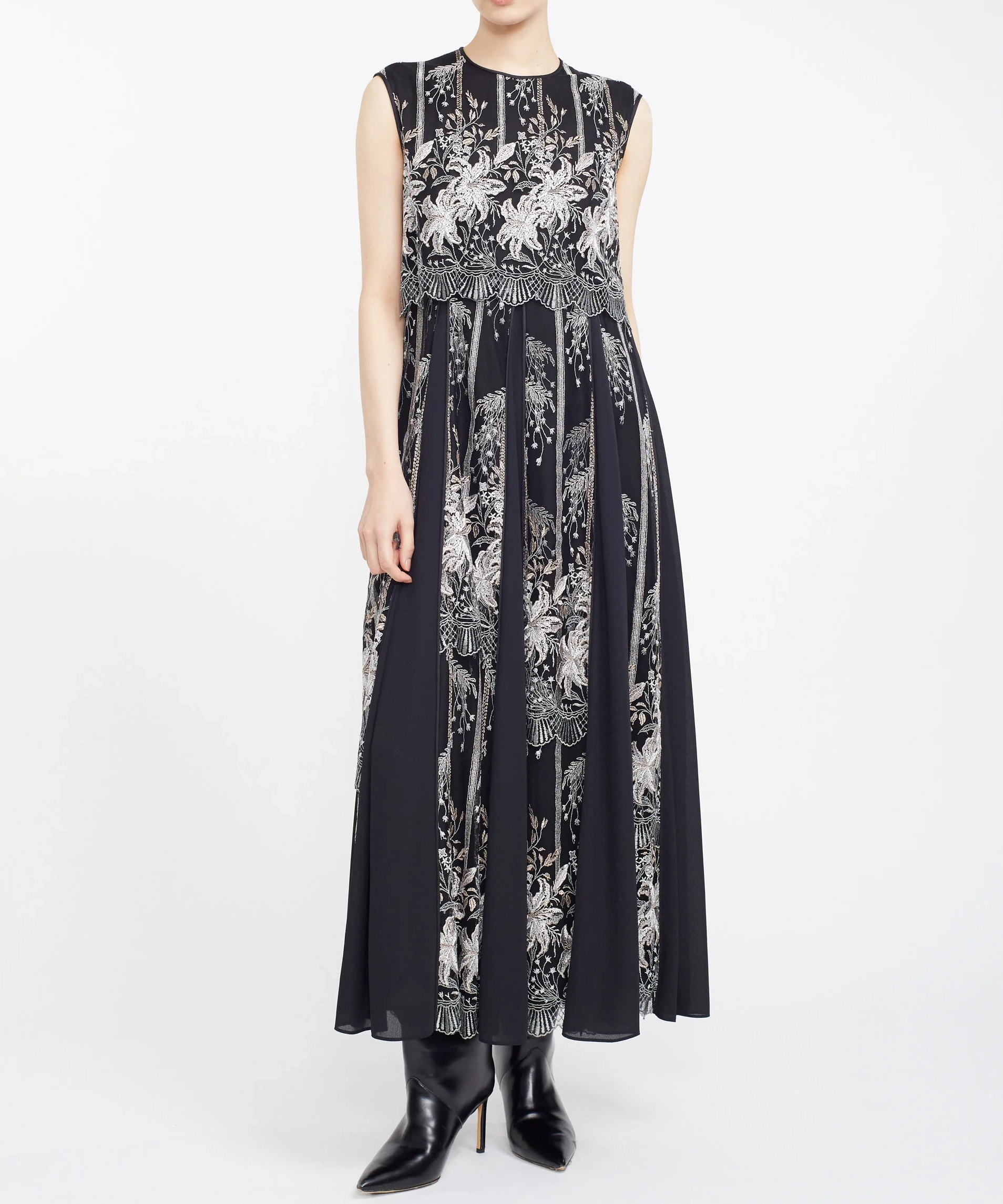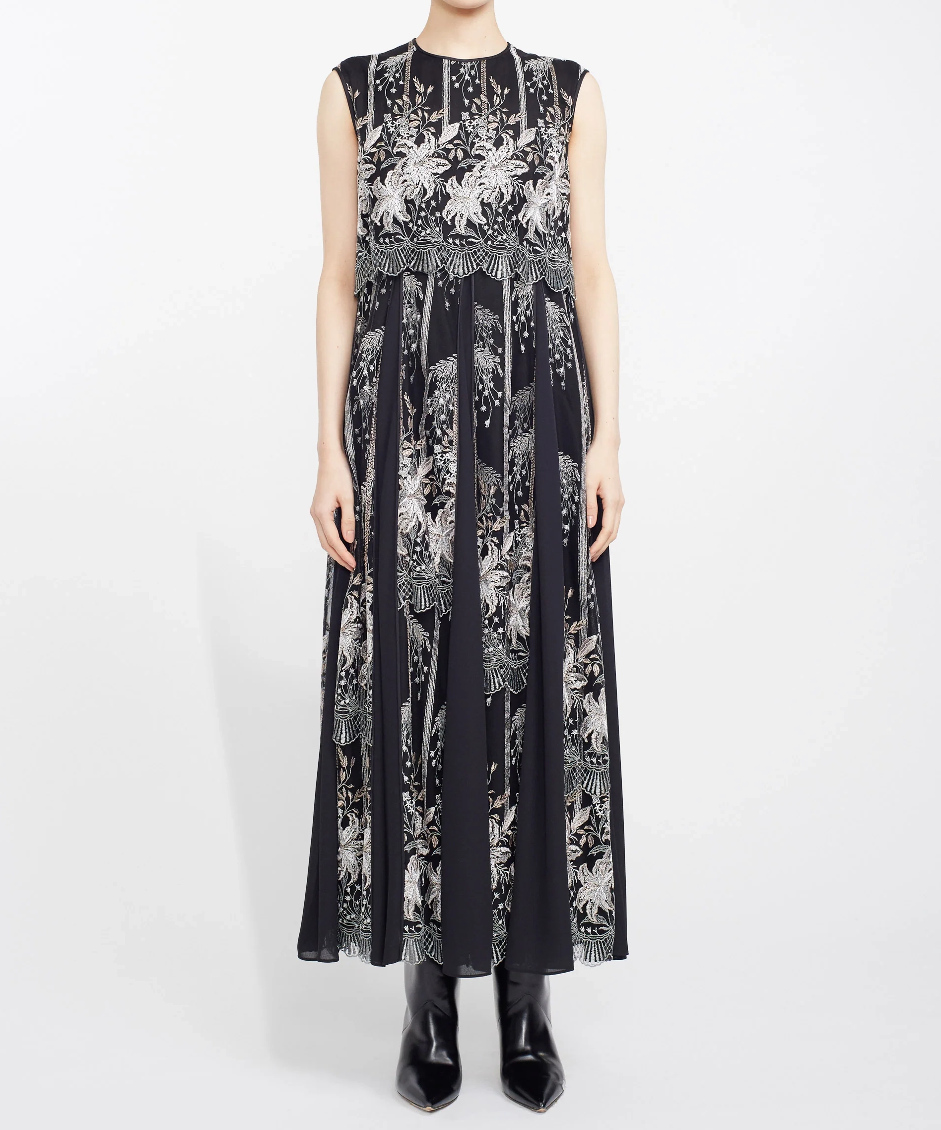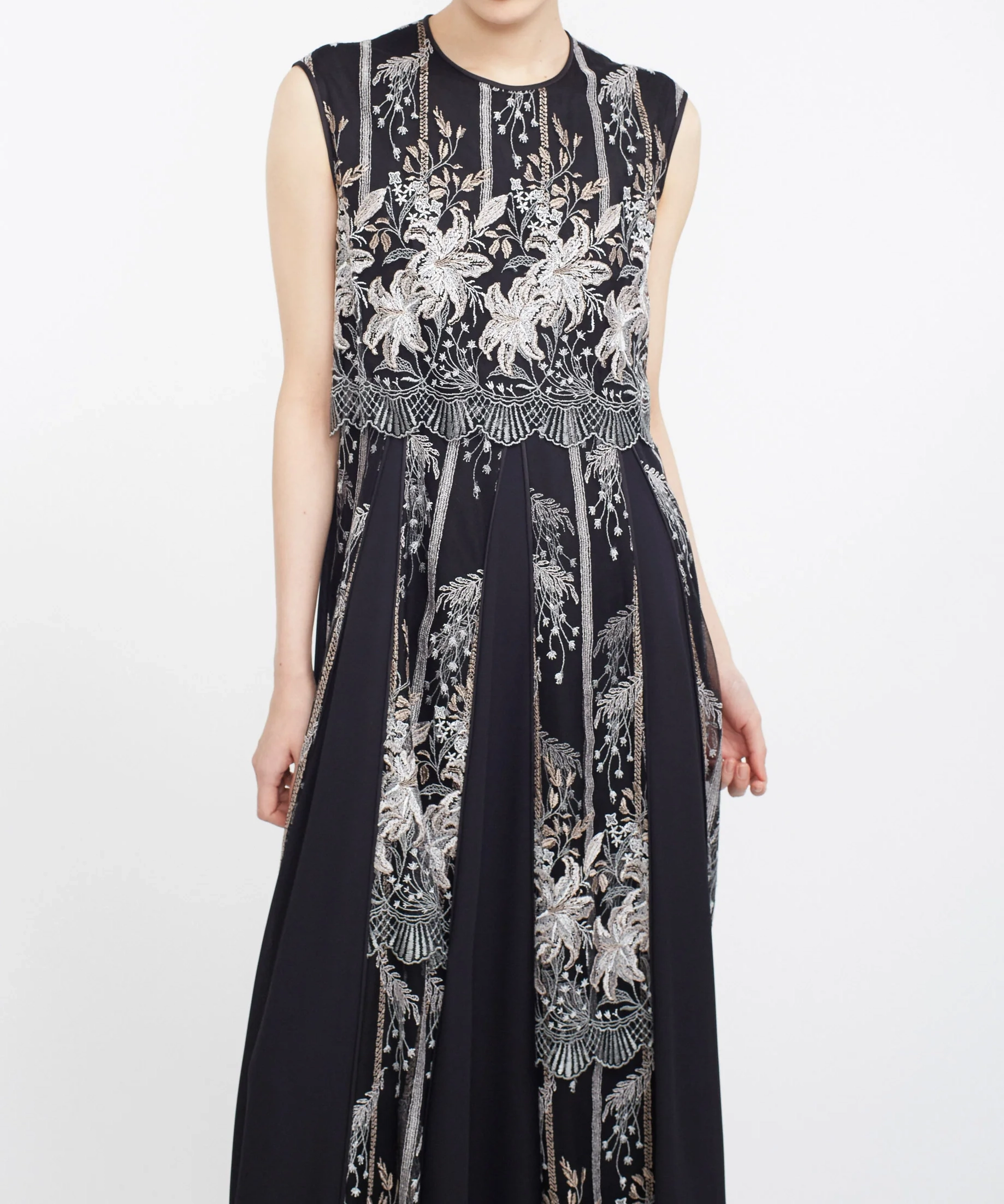 MURRALらしい芸術的な刺繍が目を引くドレス。繊細なラインで描かれたモチーフが、シンプルなベースに映え、上品で洗練された印象を演出します。