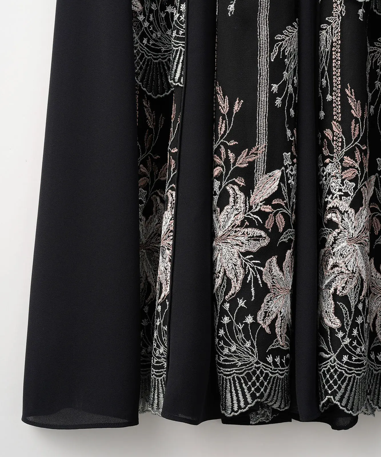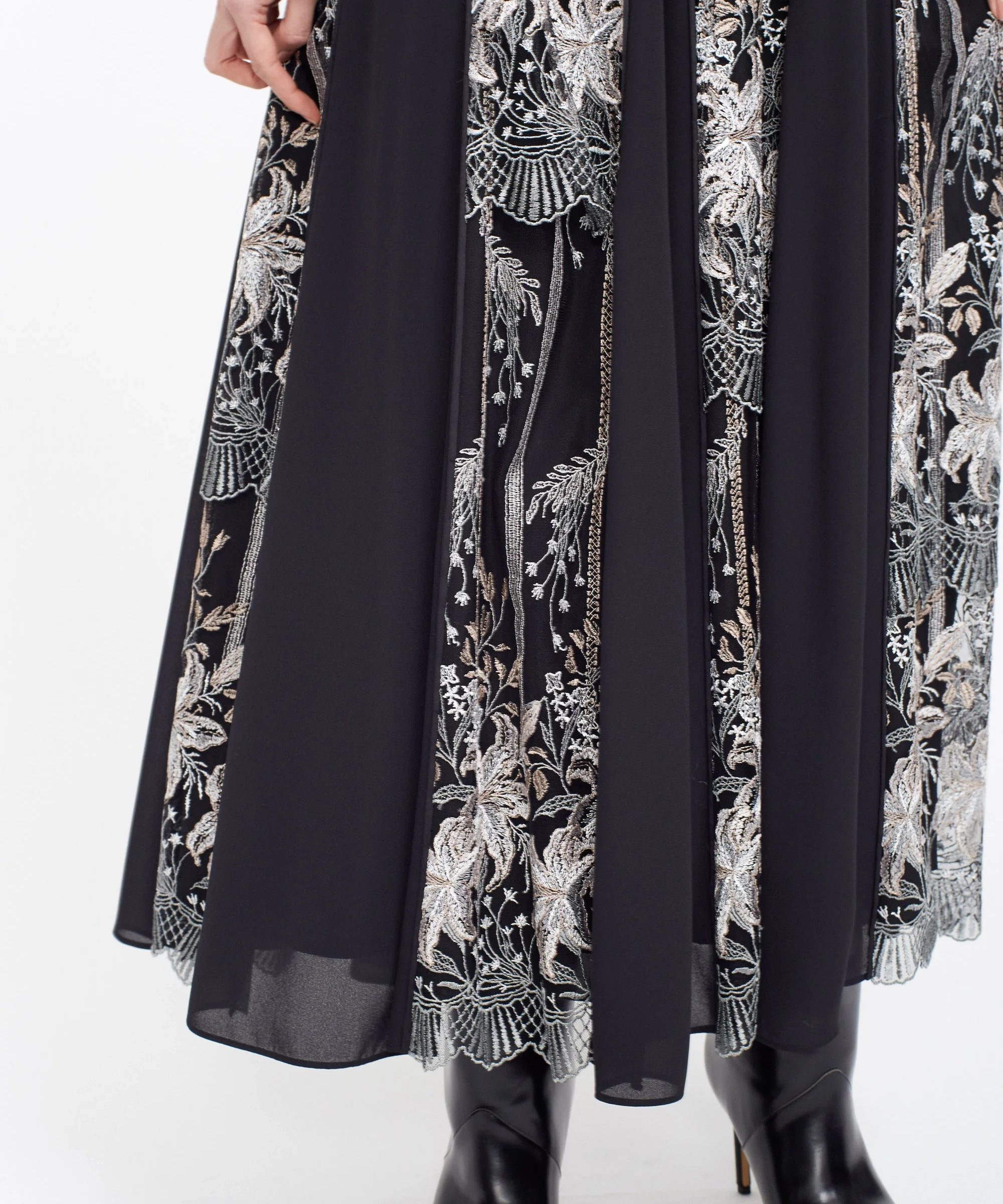 繊細な刺繍とミニマルなシルエットのバランスが美しい一着です。派手すぎないのに印象に残るデザインで、結婚式やホテルディナーなど、上品さを求められるシーンにぴったり。身体のラインを拾いすぎないため、幅広い体型の方におすすめです。