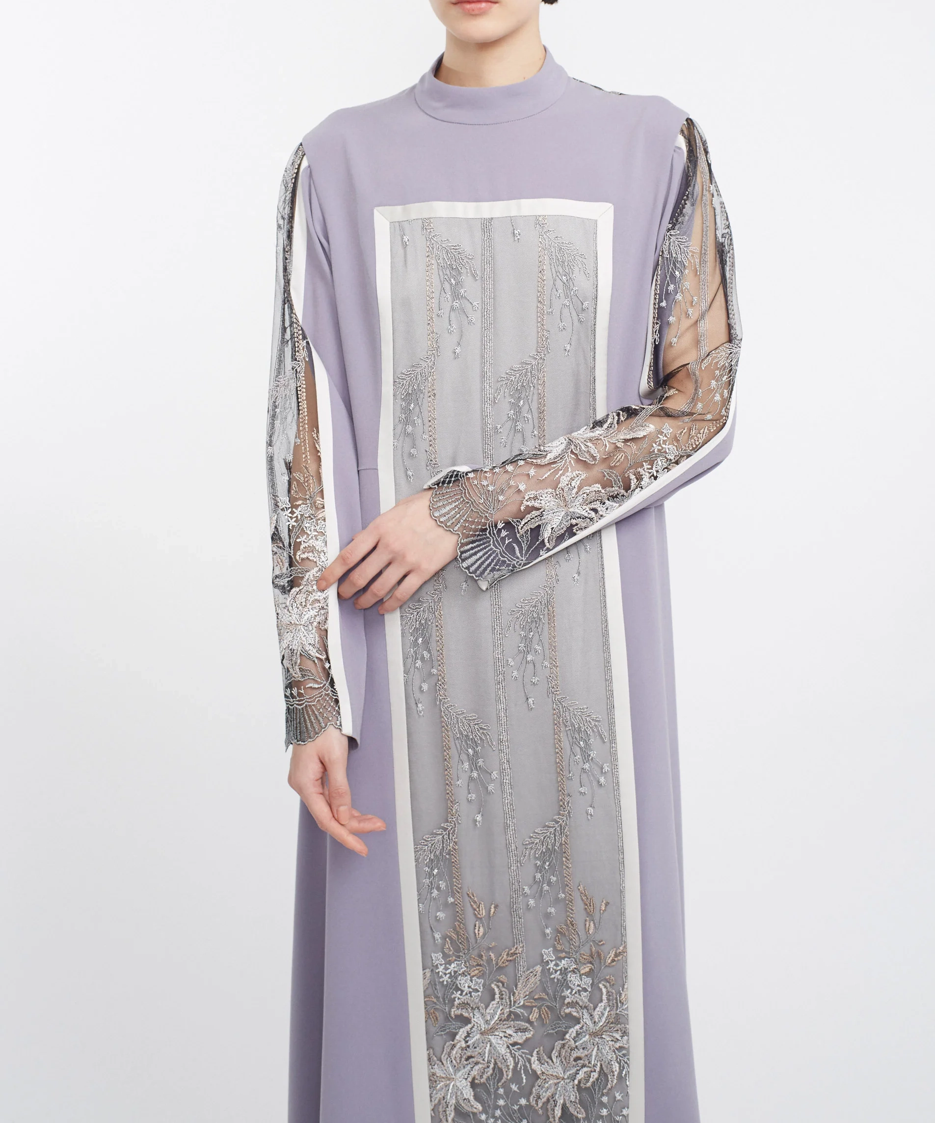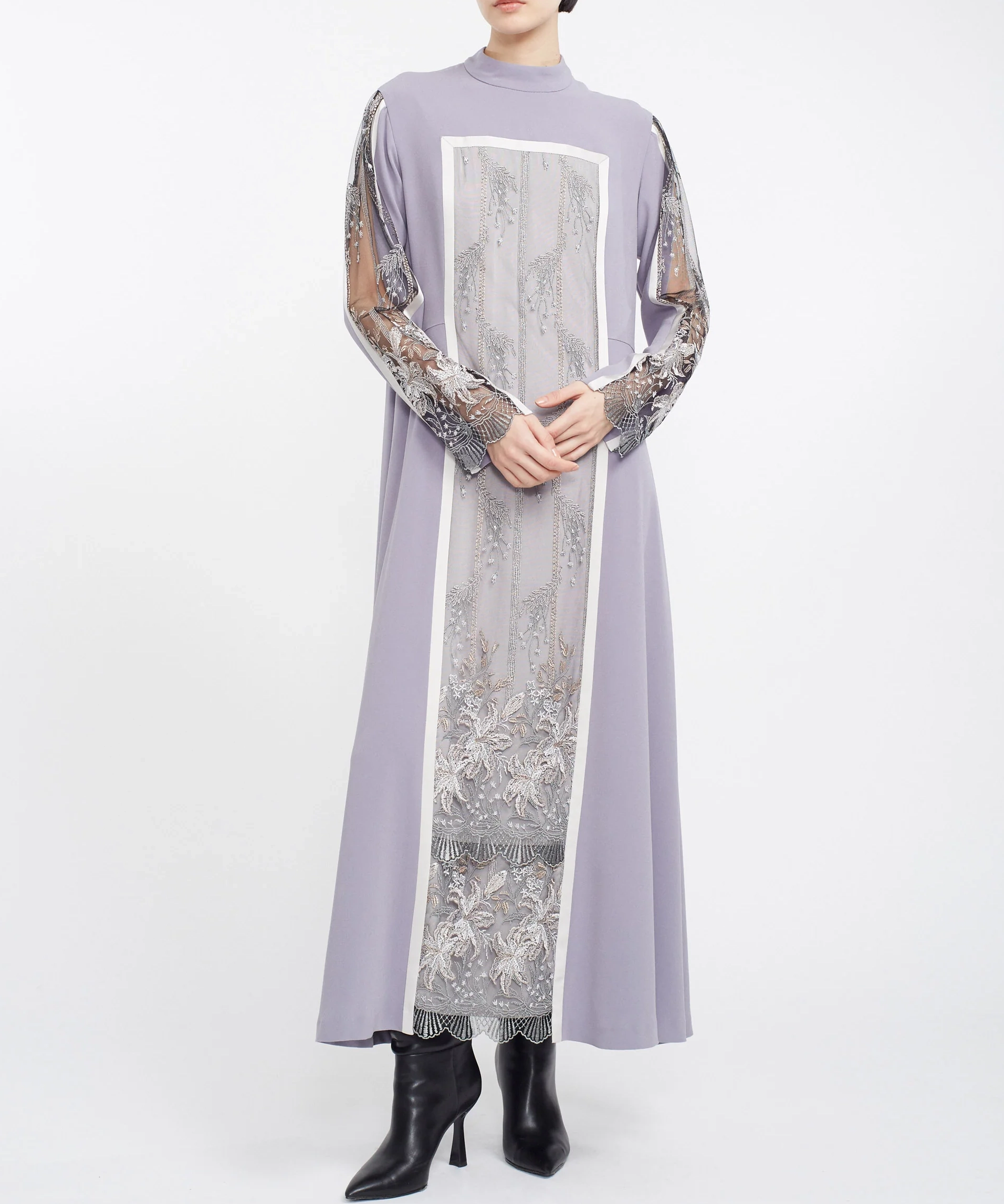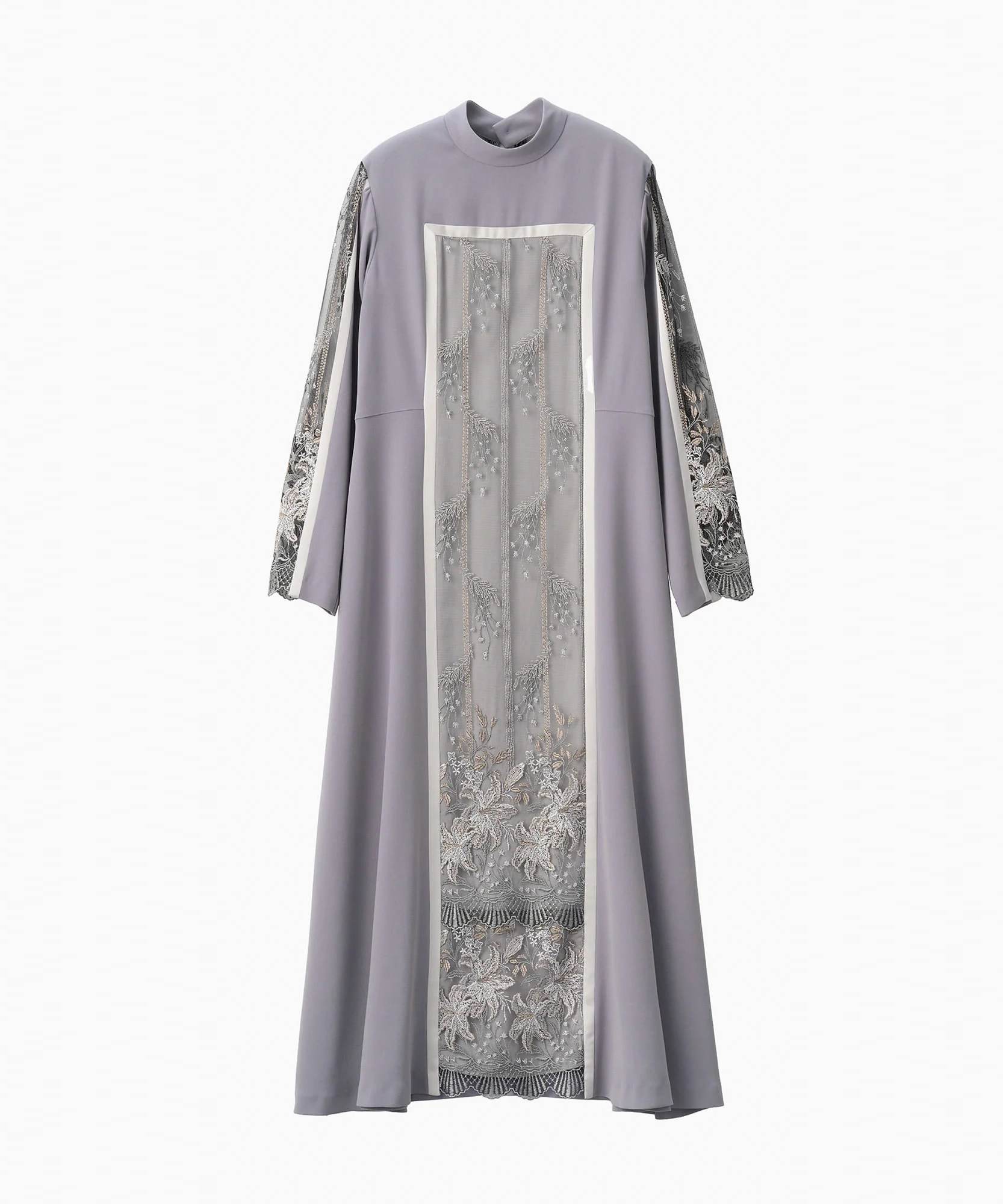 MURRALらしい繊細な刺繍が主役のドレスで、1枚でコーディネートが完成する存在感のあるアイテムです。落ち着いたカラーと上品なデザインで、結婚式やパーティーはもちろん、ホテルディナーなどにもおすすめ。縦のラインを強調するシルエットで、すっきりとした印象に見せてくれます。