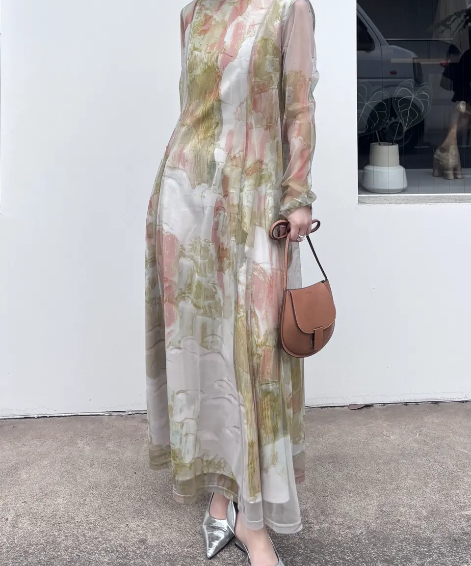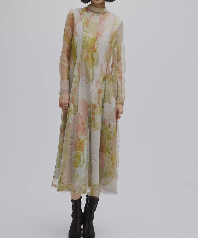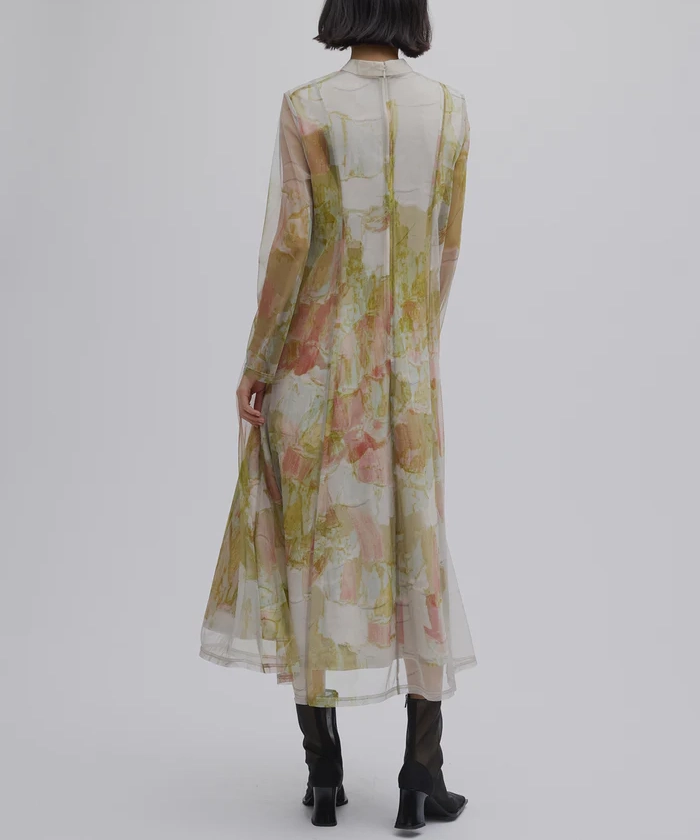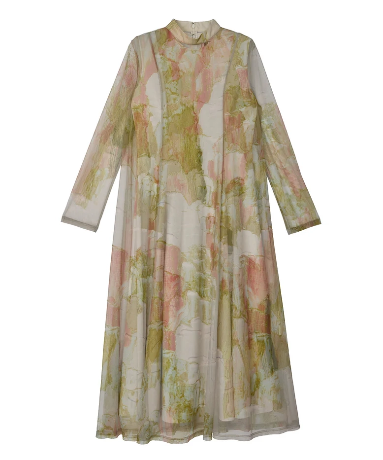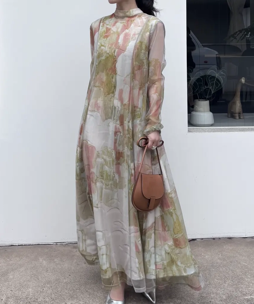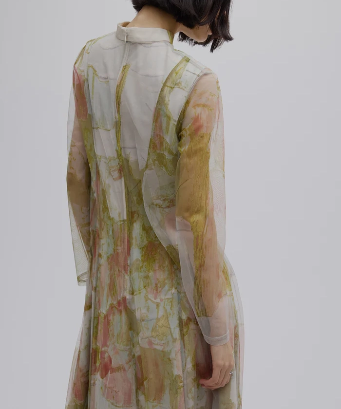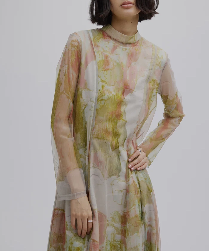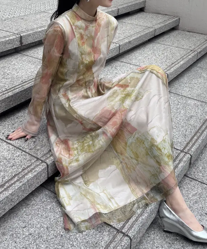 石膏アートからインスピレーションを受けて制作した、オリジナルのアート柄のレイヤードドレス。