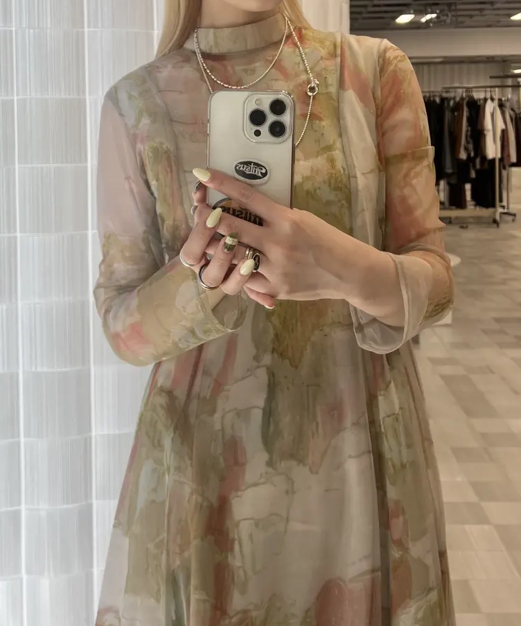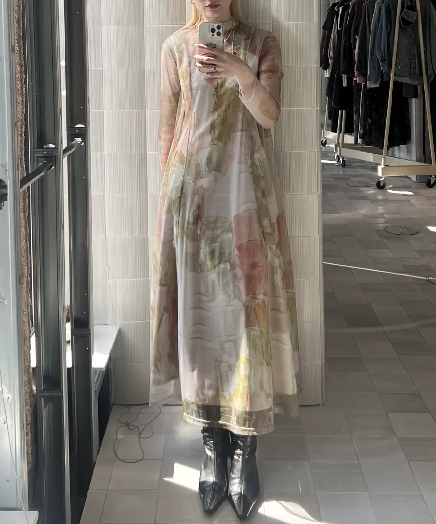 Ameriの大人気ドレス。レイヤードされているので、柄の莉っ体感を楽しんでいただけます。インナーワンピースは少し毛羽立ちがございます。